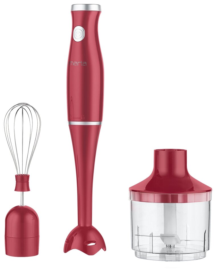 тип: погружной, максимальная мощность: 900 Вт, материал погружной части: пластик, насадки: венчик для взбивания, измельчитель, емкость измельчителя: 0.50 л