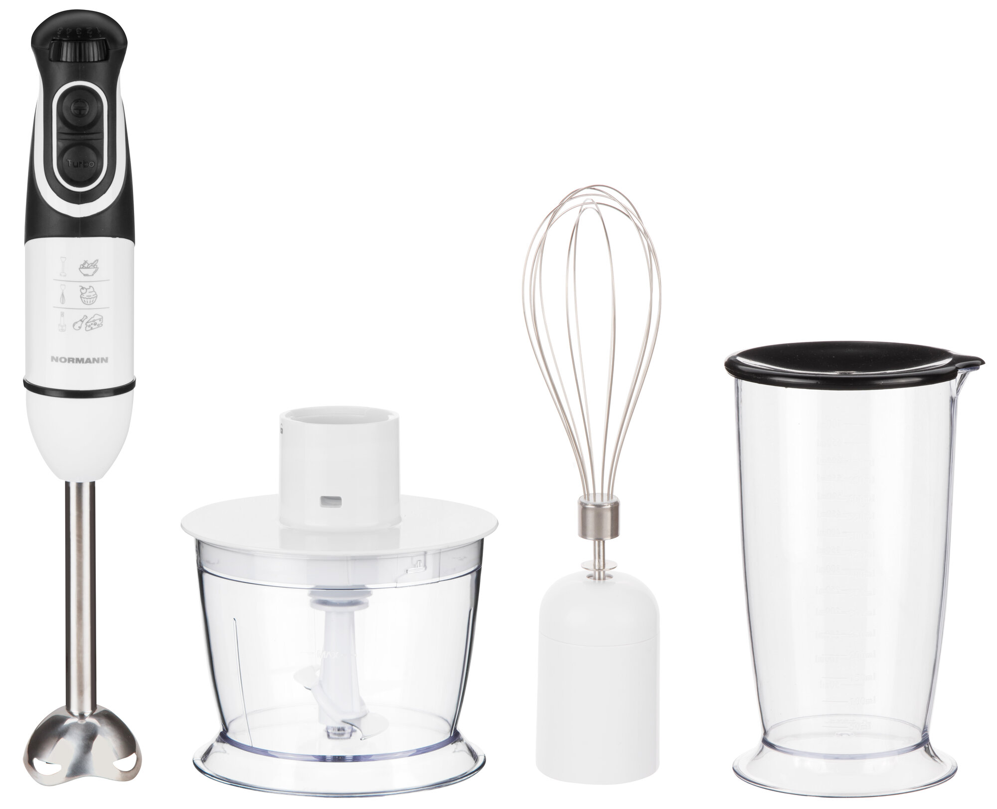 В комплекте идет измельчитель объемом 500 мл, мерный стакан 700 мл с крышкой, венчик для взбивания и смешивания жидких продуктов.