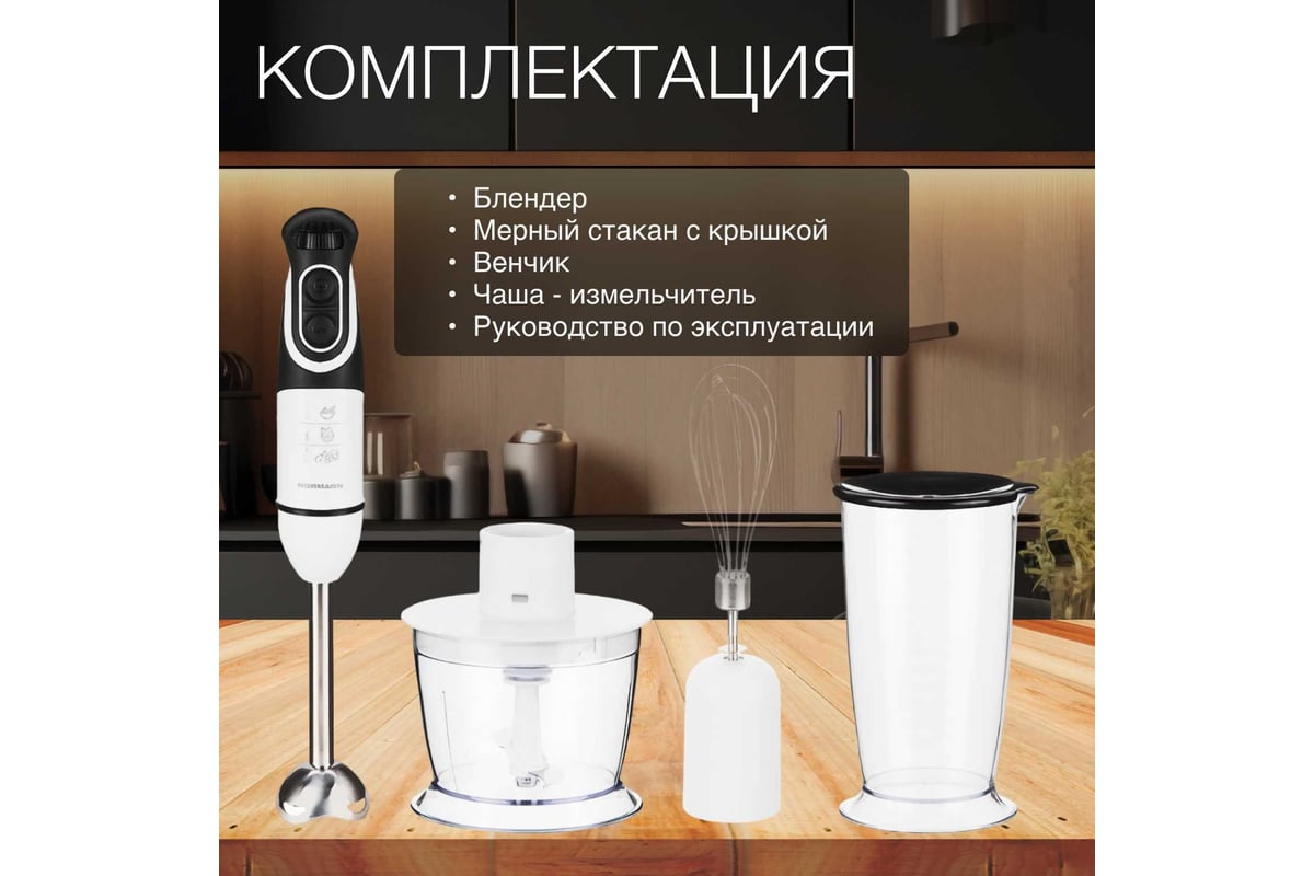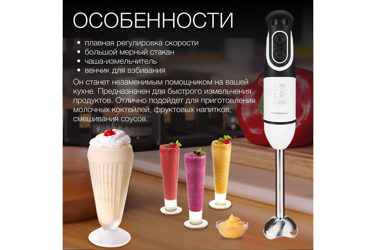 Погружной блендер NORMANN AHB-542 станет незаменимым помощником на вашей кухне. Предназначен для быстрого измельчения продуктов. Отлично подойдет для приготовления молочных коктейлей, фруктовых напитков, смешивания соусов.