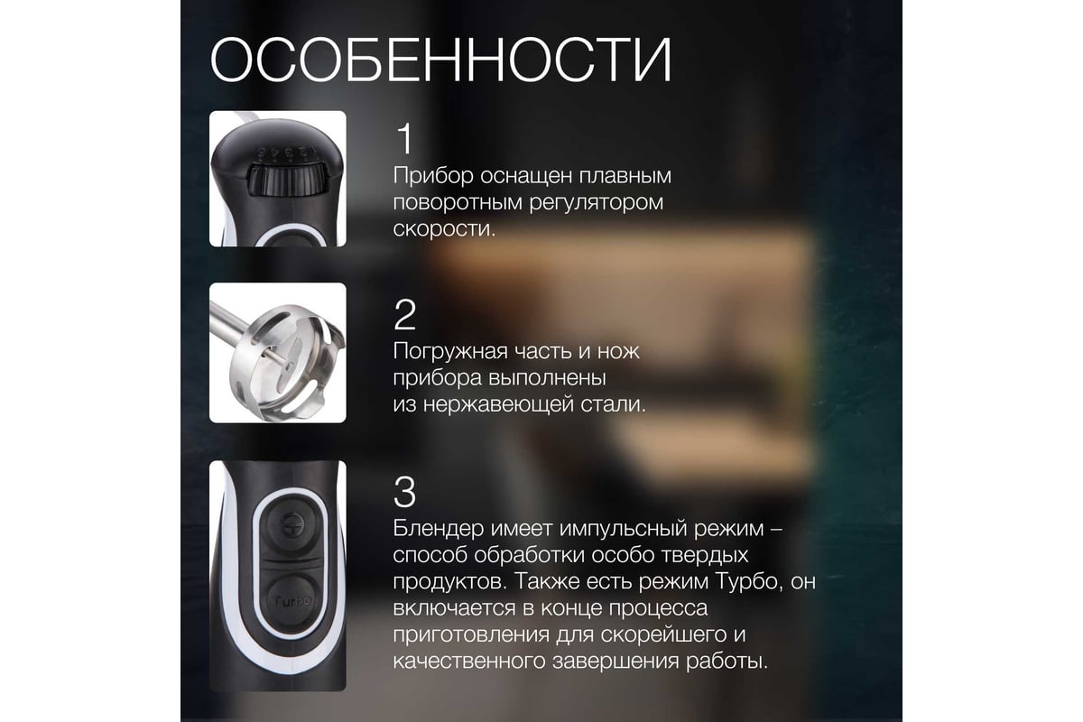 Прибор оснащен поворотным регулятором скорости. Блендер имеет импульсный режим ‒ способ обработки особо твердых продуктов. Также есть режим Турбо, он включается в конце процесса приготовления для скорейшего и качественного завершения работы. Турбо режим позволяет быстро превратить в пюре особо мягкие и нежные продукты.