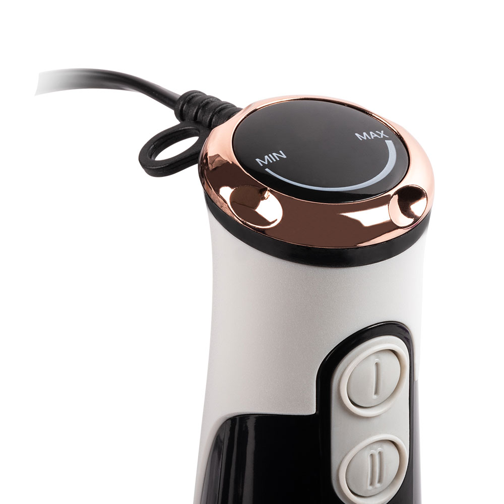 Особенности и дополнительные функции Специальная форма погружной насадки предотвращает попадание брызг на рабочую поверхность, Эргономичный дизайн, Низкий уровень шума и вибрации, Два режима скорости + плавная регулировка скорости, Материал ножей - нержавеющая сталь, Плавная регулировка скорости, Снятие насадки одним легким движением