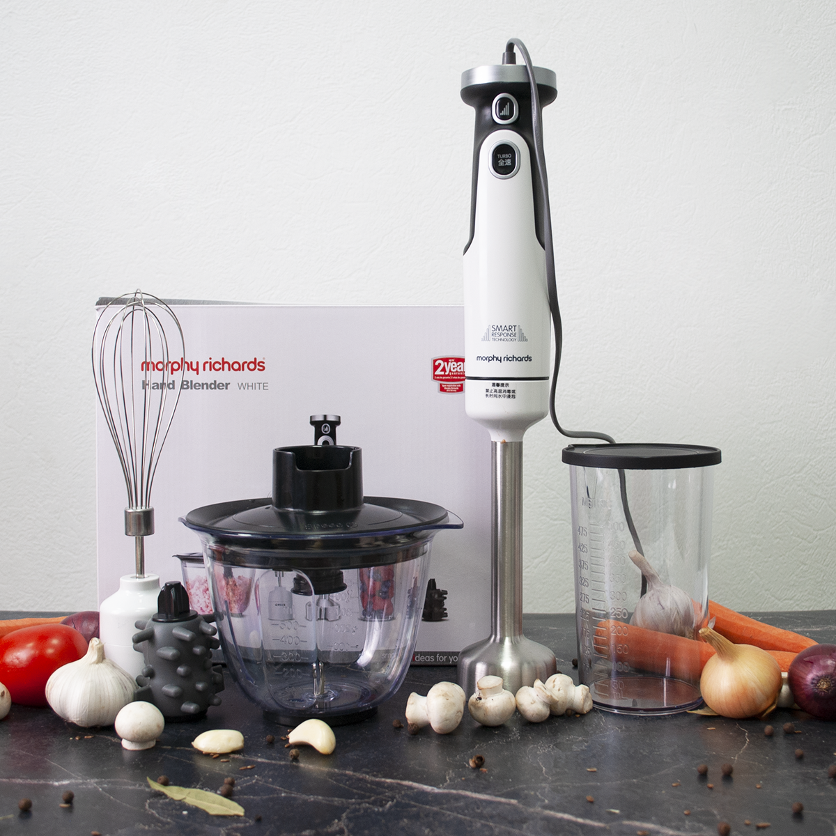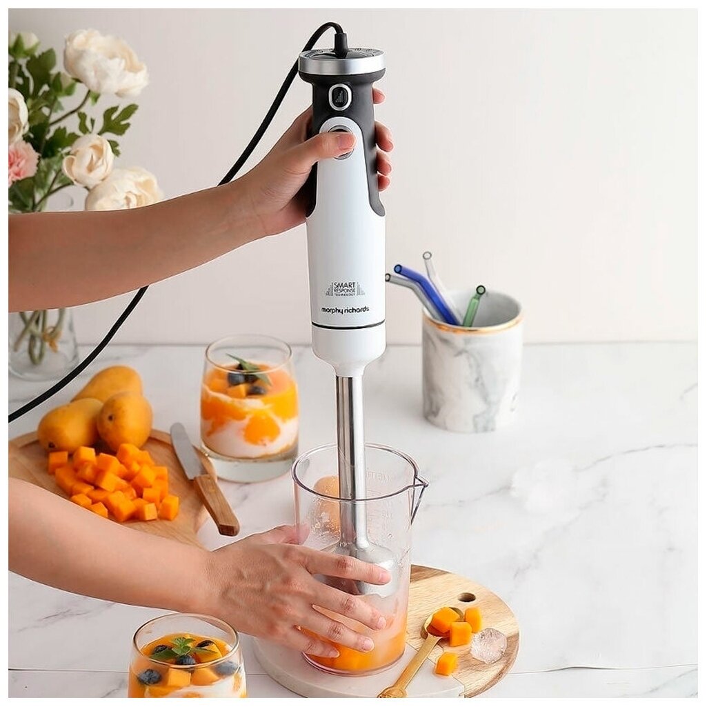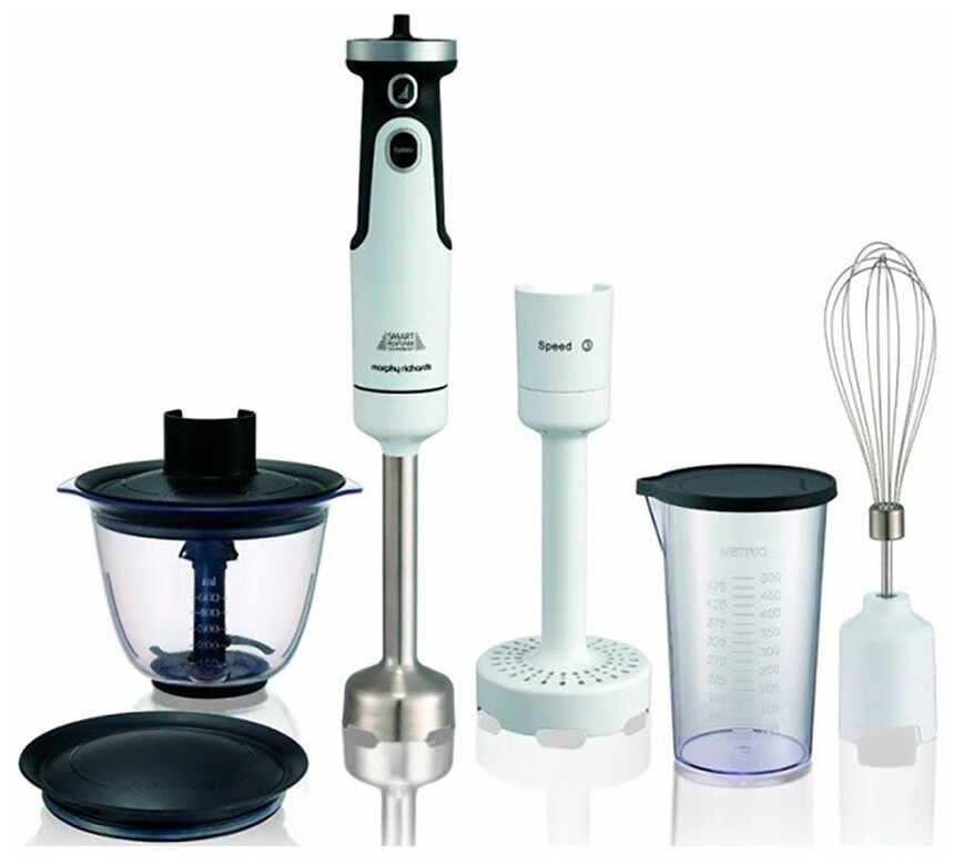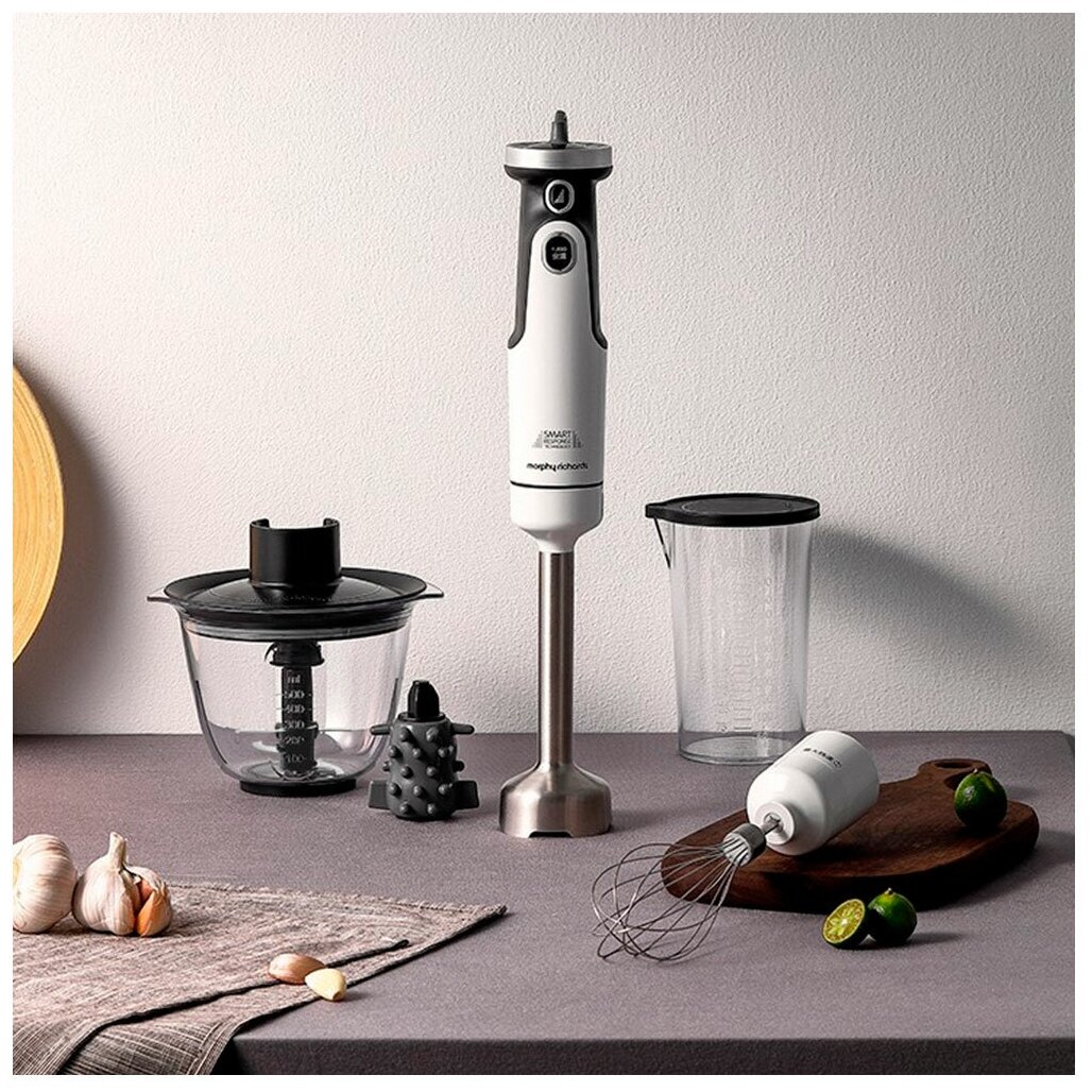 Комплектация: блендер (моторный блок) - 1 шт, насадки - 4 шт (чеснокочистка, венчик, насадка-блендер, нож 2 лезвия), стакан с крышкой 0,5л, чаша измельчителя 0,5л. В зависимости от партии поставляется с евровилкой или европереходником. . Инструкция на русском языке по QR коду (указан на коробке).