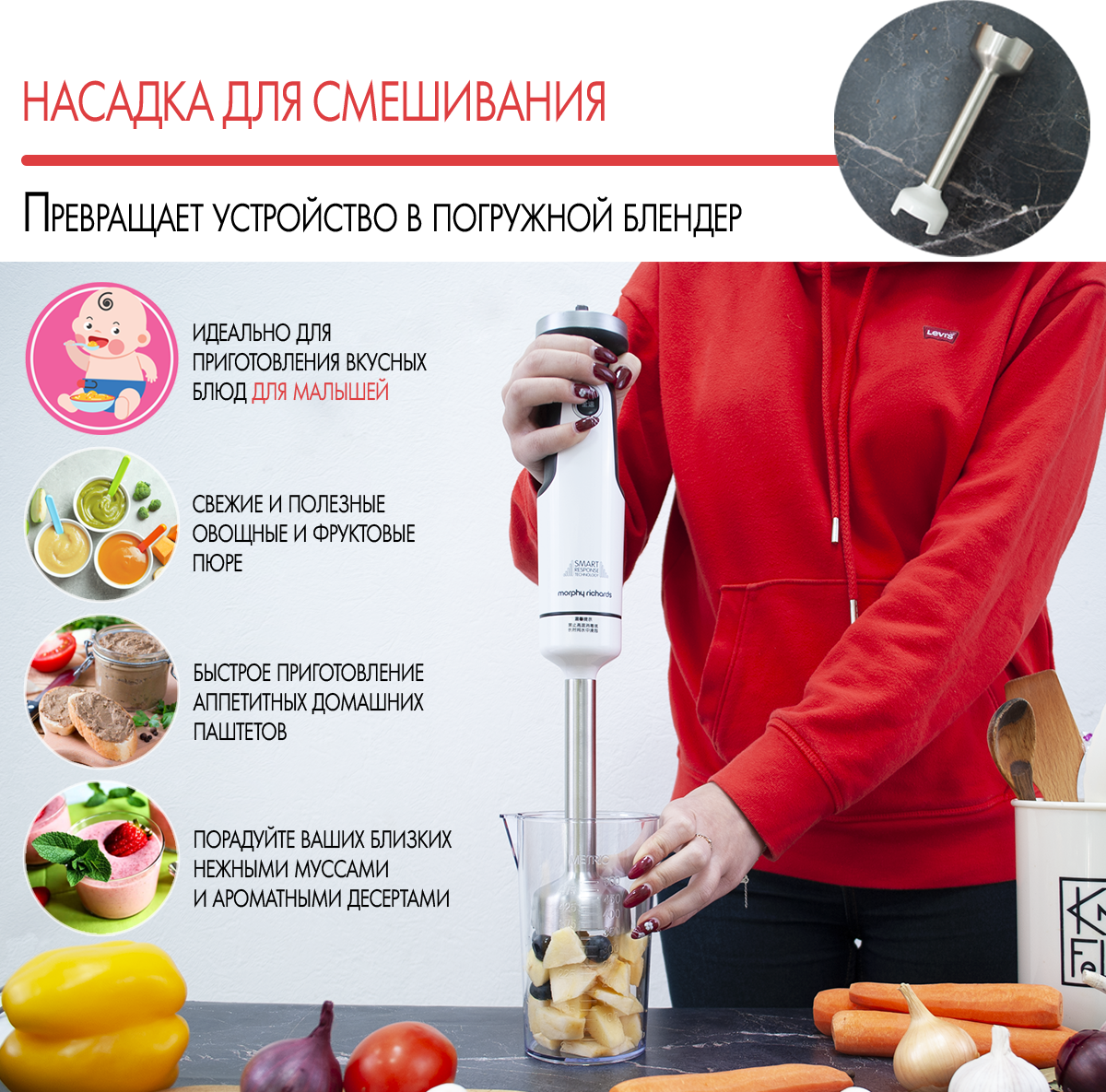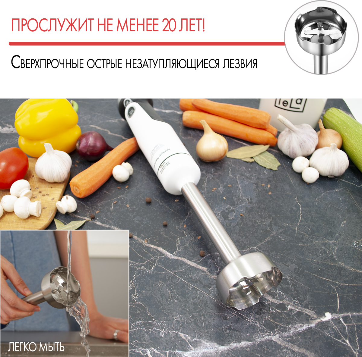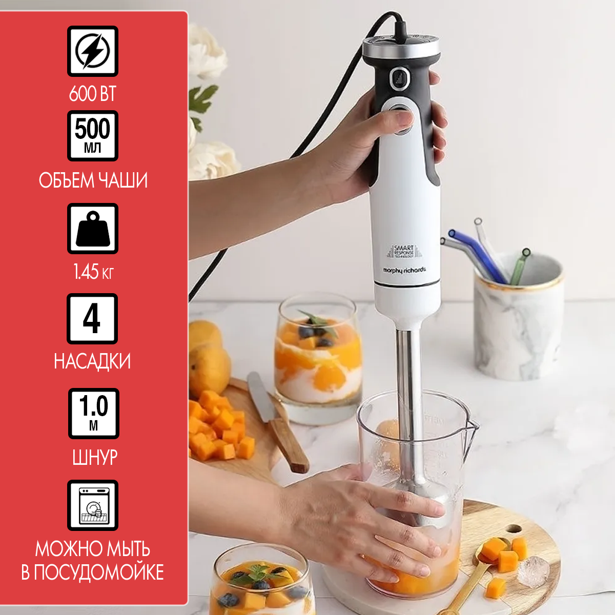 Комплектация: блендер (моторный блок) - 1 шт, насадки - 4 шт (чеснокочистка, венчик, насадка-блендер, нож 2 лезвия), стакан с крышкой 0,5л, чаша измельчителя 0,5л. В зависимости от партии поставляется с евровилкой или европереходником. . Инструкция на русском языке по QR коду (указан на коробке).