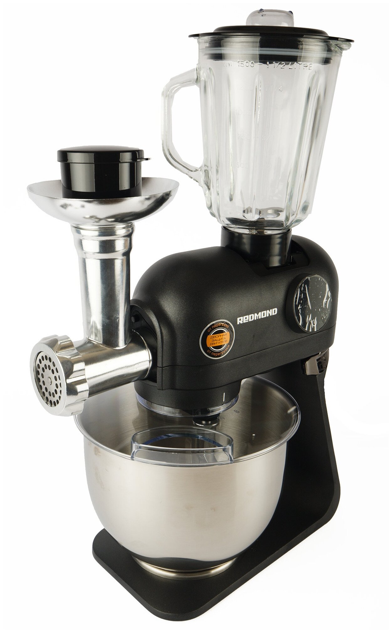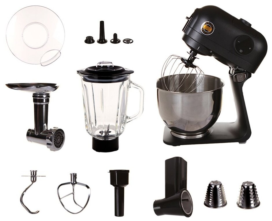 насадка для приготовления колбасок; насадка-венчик; насадка для замешивания теста; кувшин блендера; чаша с крышкой; толкатель; терка - 3; насадка для взбивания; насадка для приготовления кеббе