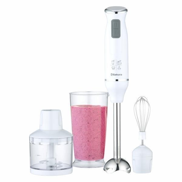 Комплектация: погружная часть, насадка-венчик, градуированный стакан (0,7 л), чоппер (0,5 л)