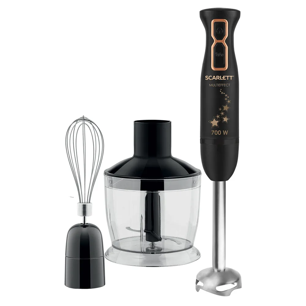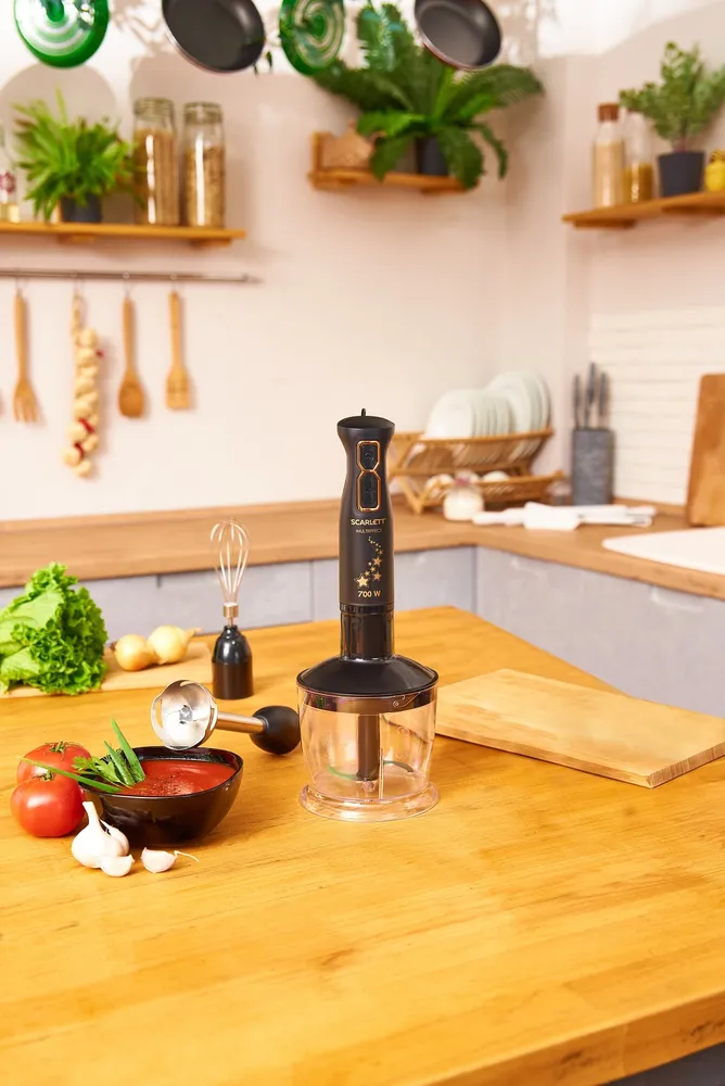Функциональность блендера обеспечивает продуманный комплект: чаша-измельчитель, погружной блендер, венчик для взбивания. Объем чаши 0,6 л – этого более чем достаточно для приготовления нескольких порций блюд.