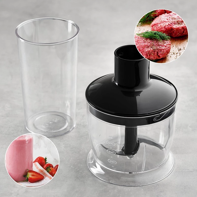 В наборе есть насадка-блендер, венчик, мерный стакан и мини-измельчитель.