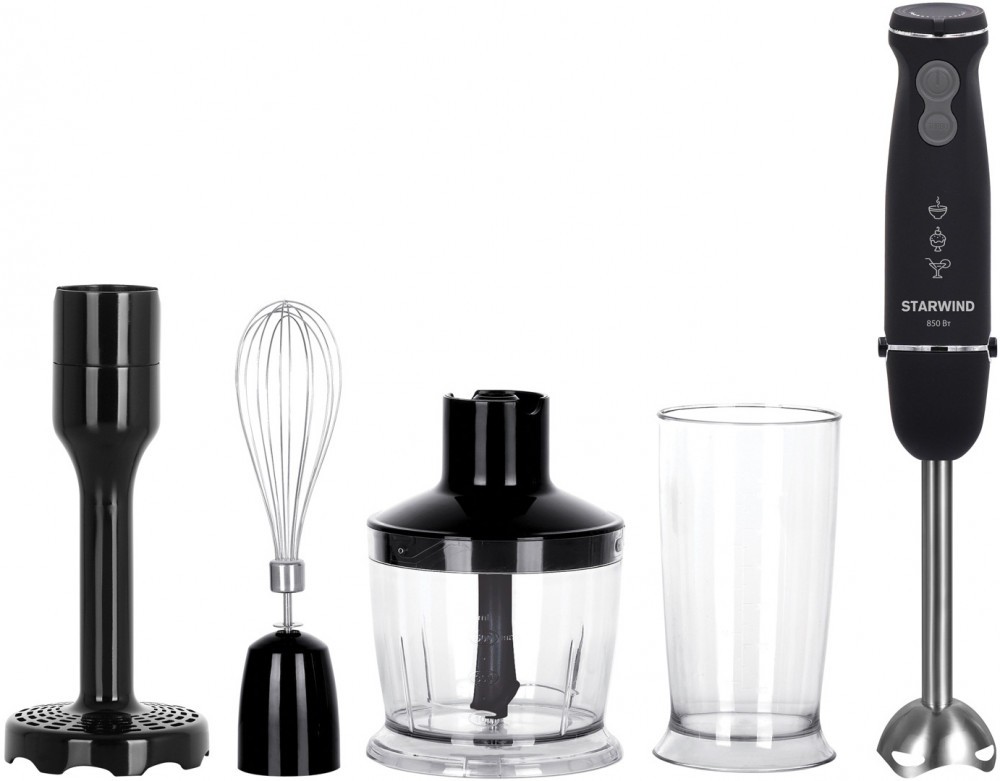 погружной блендер, мощность 850 Вт, механическое управление, измельчитель, мерный стакан, корпус из пластика, плавная регулировка скорости