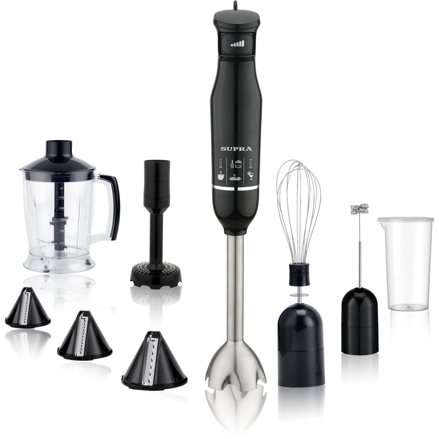 Комплектация блендер, съемная насадка-блендер из нержавеющей стали, съемная насадка-венчик из нержавеющей стали, венчик для взбивания молочной пенки, измельчитель с конусными насадками 1,25 л., насадка для картофельного пюре, мерный стакан с крышкой 600 мл., инструкция на русском языке, гарантийный талон