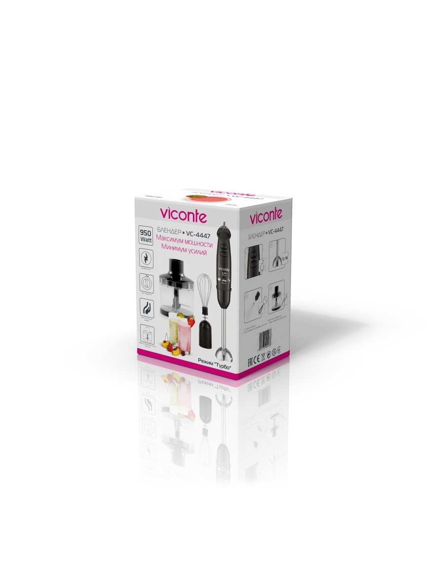 Погружной блендер, мощность 950 W, современный эргономичный дизайн, пульсовый режим работы, 2 скорости, лезвия из нержавеющей стали, металлическая нога блендера, венчик для взбивания, чаша с ножом для рубки и измельчения, 500 мл; автоматическая блокировка при неправильно установленной насадке, удобство и простота в обращении и чистке.