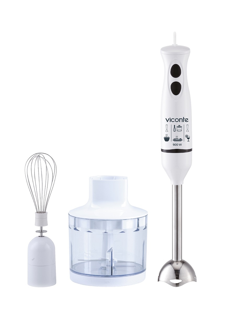 Погружной блендер Viconte VC4449 900 W, Погружной блендер, мощность 900 W, современный эргономичный дизайн, пульсовый режим работы, 2 скорости, лезвия из нержавеющей стали, металлическая нога блендера, венчик для взбивания, чаша с ножом для рубки и измельчения, 500 мл; автоматическая блокировка при неправильно установленной насадке, удобство и простота в обращении и чистке.