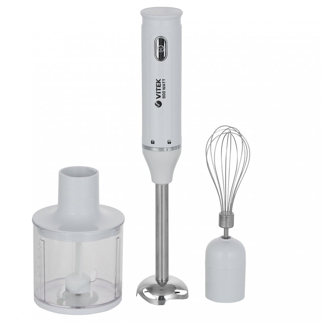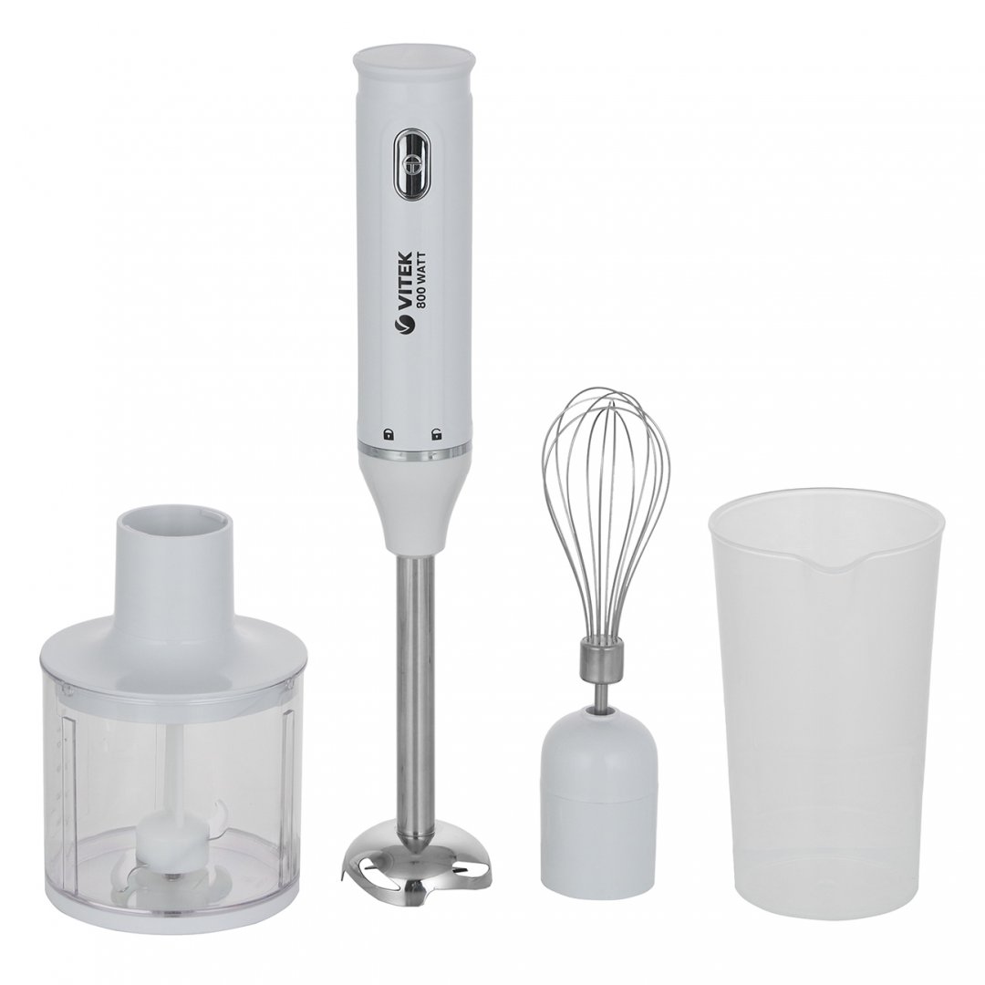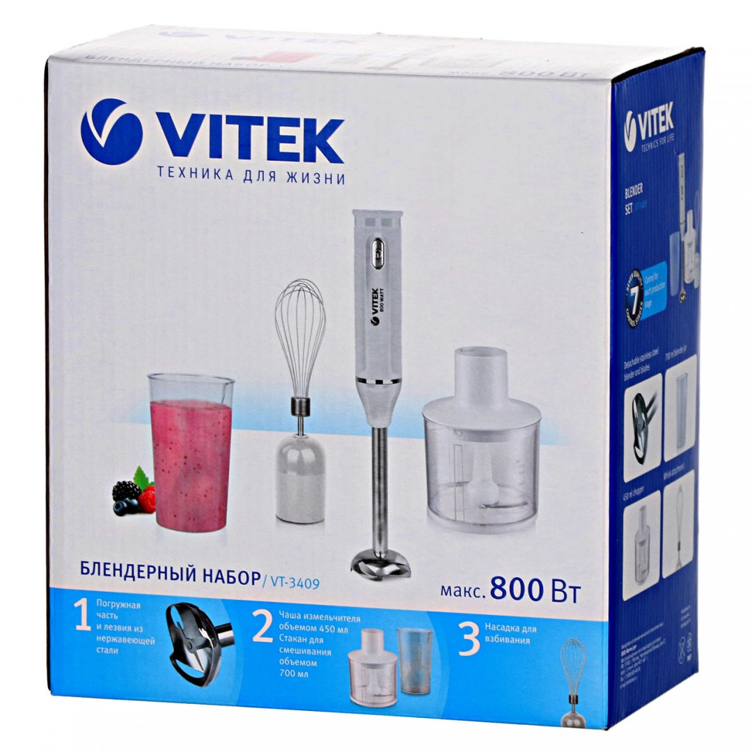 Ножи, венчики и погружная часть основной насадки изготовлены из нержавеющей стали и не покрываются коррозией. Сплав не влияет на вкусовые свойства продуктов. Мерный стакан из прозрачного пластика рассчитан на 500 мл и имеет деления на стенке. Погружной блендер VITEK VT-3409 оснащен удобной эргономичной ручкой с нескользящим покрытием. Насадки и емкости можно очищать водой с применением неабразивного моющего средства для посуды.