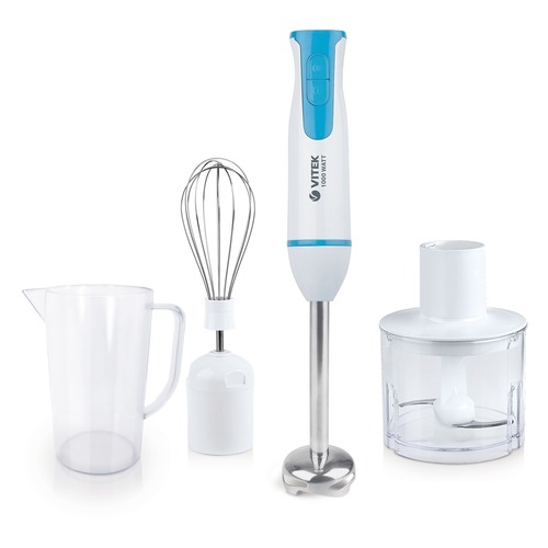 тип: погружной, мощность: 1000Вт, скоростей/режимов 2, рабочая поверхность нержавеющая сталь, измельчитель, венчик для взбивания, защита от перегрузки, цвет: белый