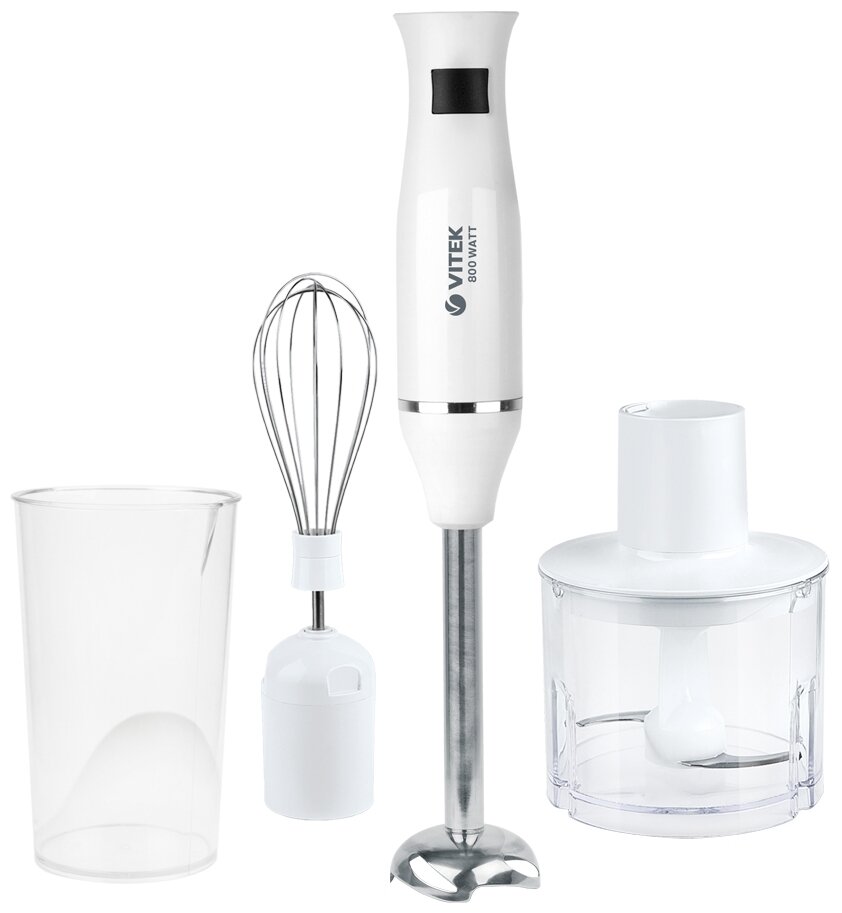 материал погружной части - нержавеющая сталь; комплект поставки: моторный блок – 1 шт., насадка-блендер – 1 шт., редуктор венчика – 1 шт., насадка-венчик – 1 шт., крышка-редуктор – 1 шт., нож-измельчитель – 1 шт., чаша чоппера – 1 шт., стакан – 1 шт., инструкция – 1 шт.