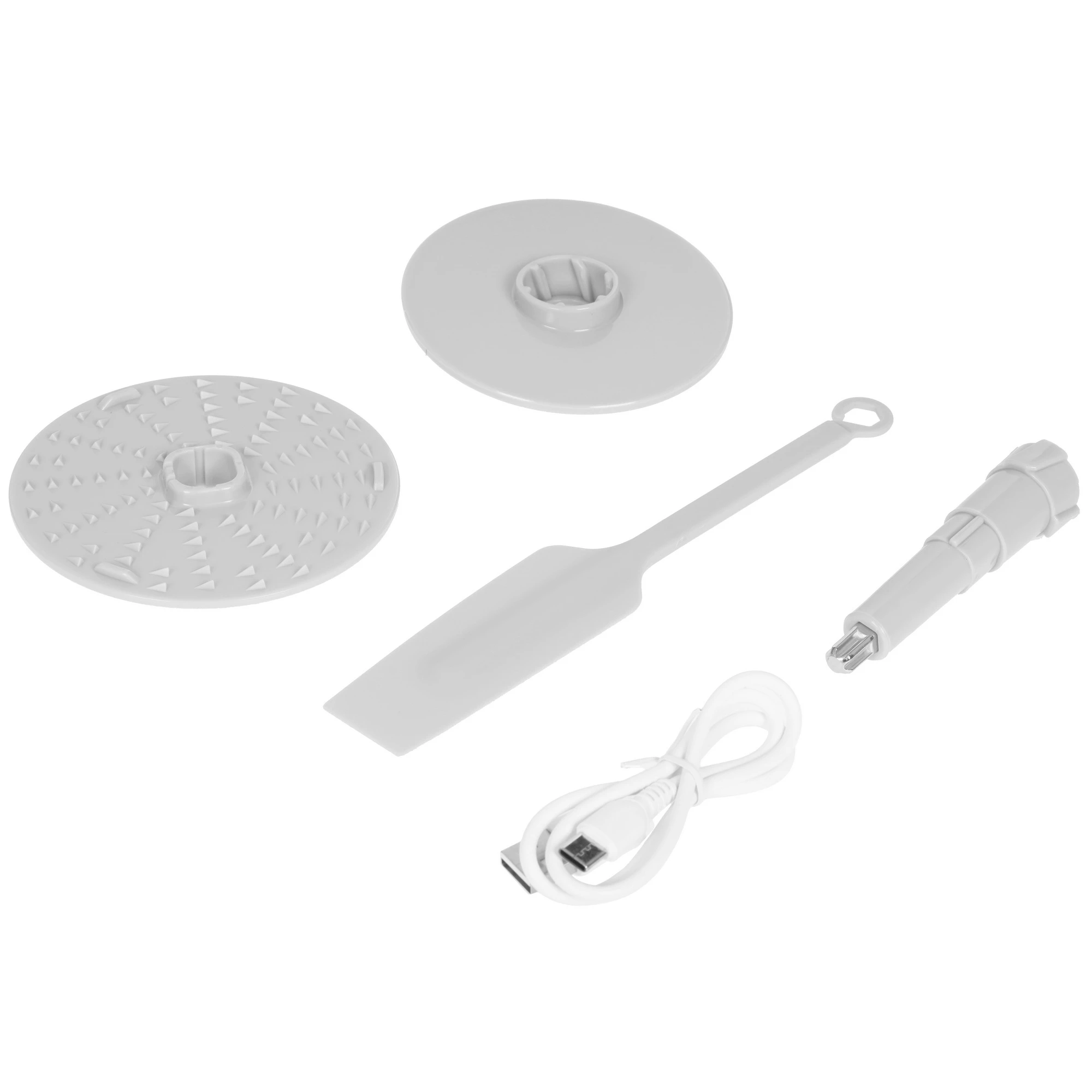 документация, кабель USB, насадка-терка средняя, пластиковая лопатка, универсальный нож, эмульсионная насадка