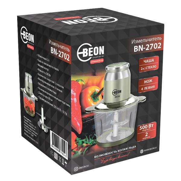 Электрический измельчитель Beon BN-2702 зеленого цвета весит 1,81 кг. Корпус измельчителя произведен из металла. Контейнер изготовлен из пластика. Модель потребляет 500 Вт. Управление устройством кнопочное.