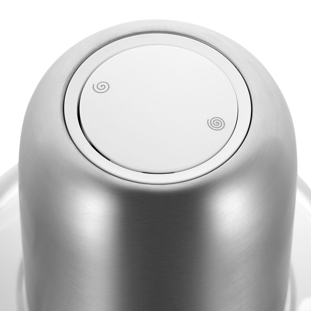 Управление прибором осуществляется с помощью двух кнопок, расположенных сверху. У измельчителя две скорости работы. Низкая скорость подходит для измельчения мягких продуктов, высокая скорость — для более твёрдых и плотных.