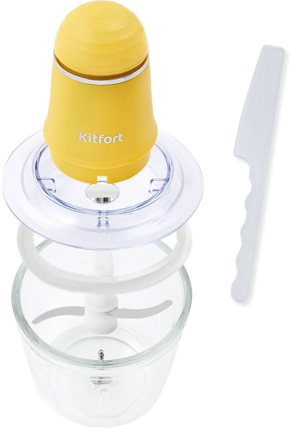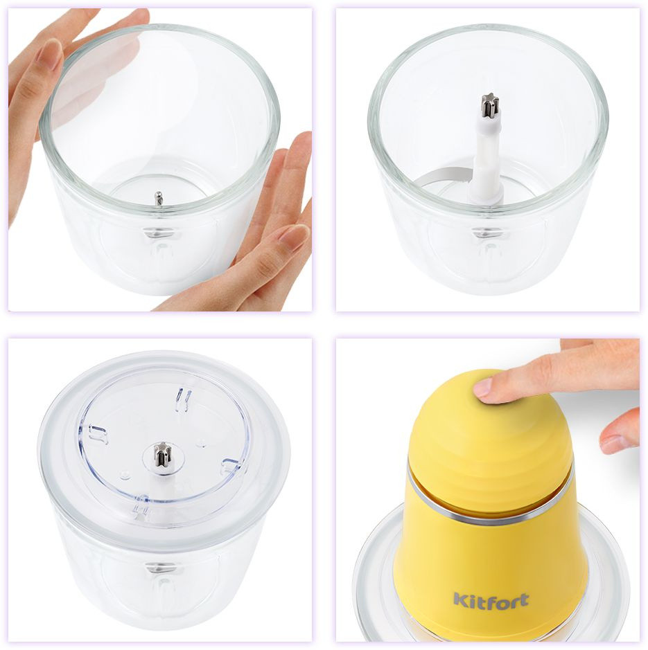 Особенности: Конструкция измельчителя полностью разборная. Чаша стеклянная, её можно закрыть крышкой и использовать для хранения продуктов. В комплекте идёт лопатка, чтобы тщательно счищать стенки чаши.