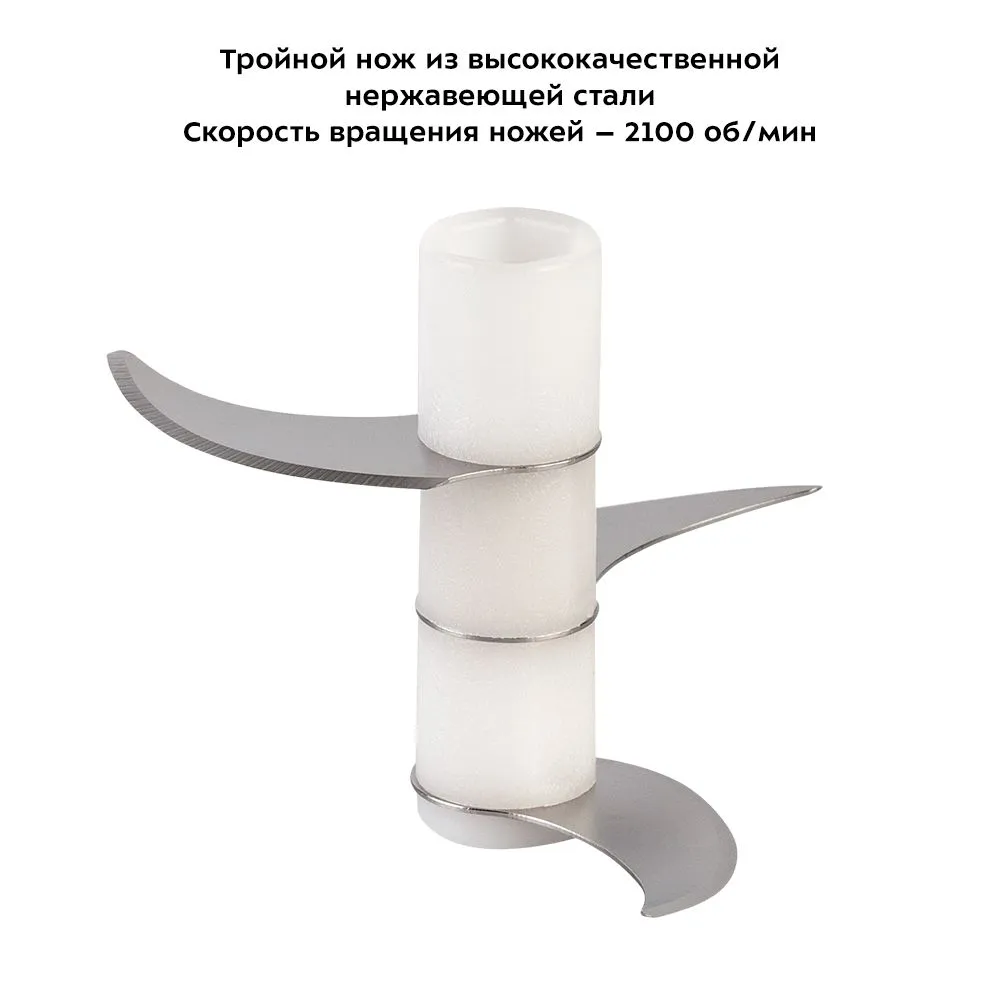 Тройной нож измельчает ингредиенты практически по всей высоте чаши, что экономит время приготовления. Лезвия изготовлены из высококачественной нержавеющей стали, скорость вращения ножей - 2100 об/мин. Салат или закуска будут готовы за несколько минут!