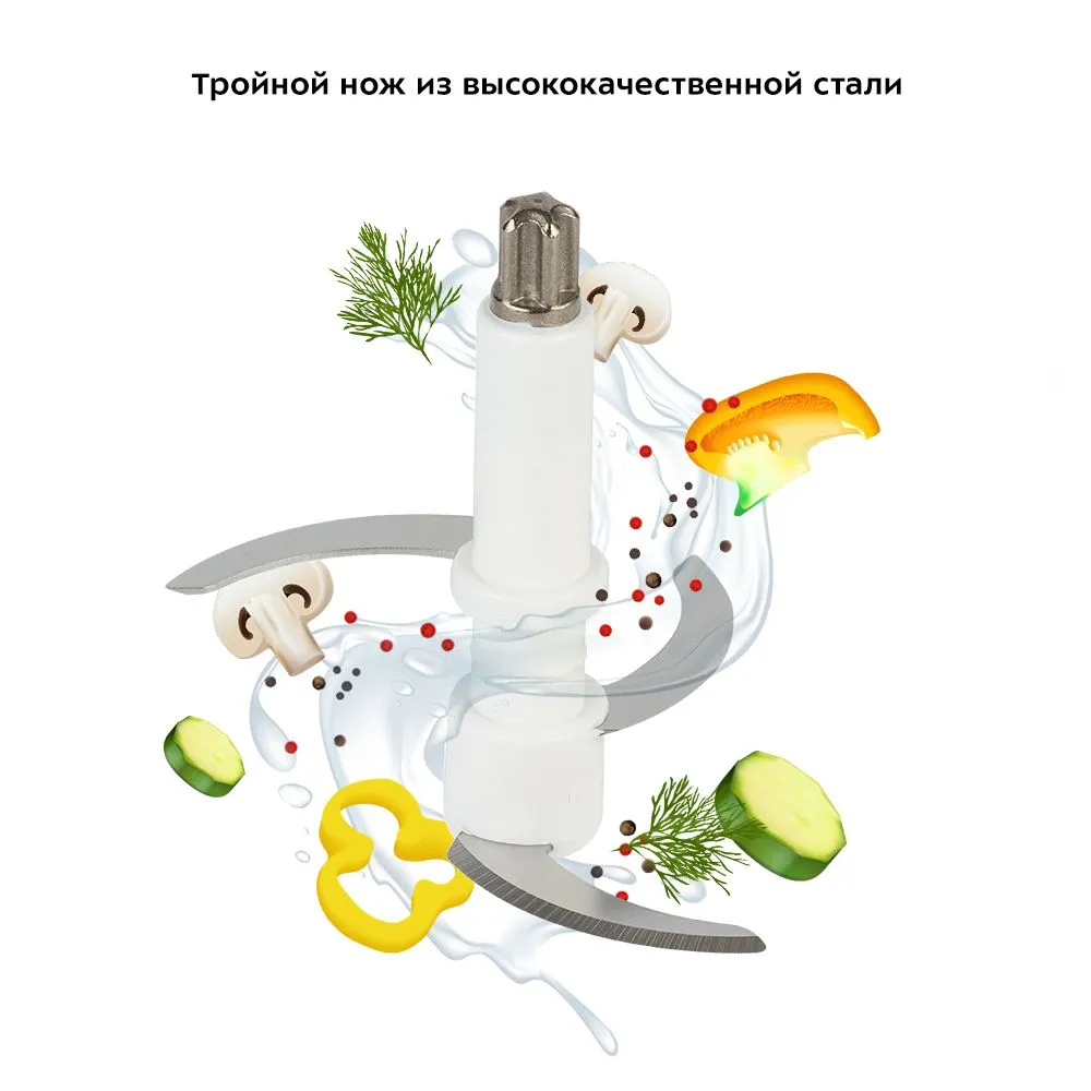 Компактный измельчитель быстро измельчает мясо, твёрдый сыр, овощи, травы, чеснок, ягоды. Он исключает ваше участие в процессе измельчения, обеспечивая безопасность и экономию времени. Готовить блюда можно гораздо быстрее!