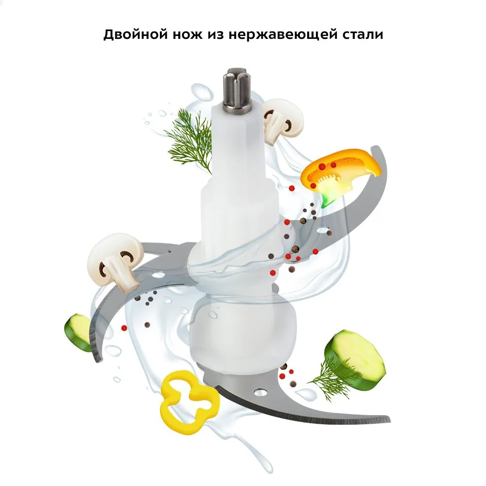 Измельчитель — устройство для быстрого измельчения мяса, твердого сыра, овощей, трав, чеснока, ягод и многих других продуктов. Двойной нож измельчает ингредиенты практически по всей высоте чаши. Процесс измельчения пищи происходит намного быстрее, чем при использовании ручных кухонных приспособлений. Простой кухонный нож для ручной нарезки и измельчения не выдерживает никакой конкуренции с этим устройством. Любой салат будет готов за считанные минуты. Все что потребуется — подготовить продукты для резки и следить за степенью измельчения.
