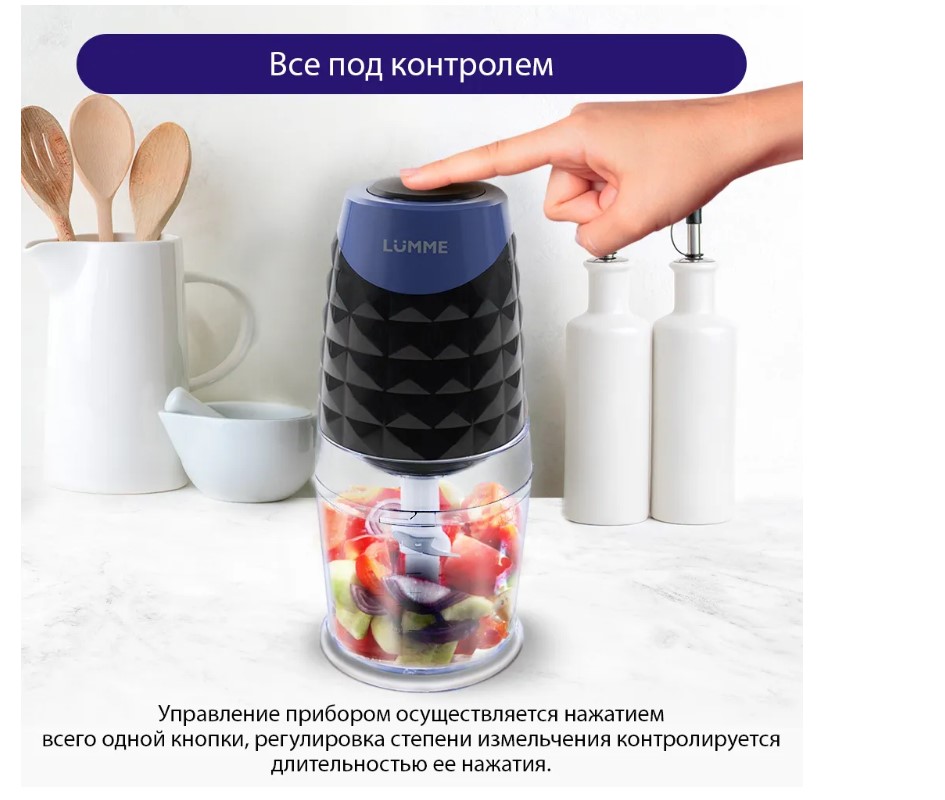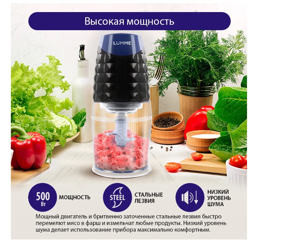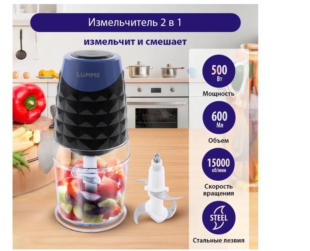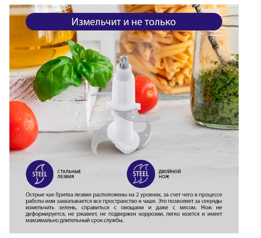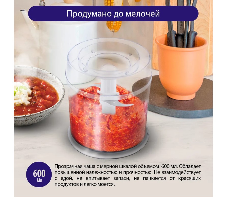 Мощный измельчитель с чашей объемом 0.6 литра. подходит для измельчения, взбивания, смешивания. 2 съёмных ножа из нержавеющей стали не деформируются, не ржавеют, не подвержены коррозии, легко моются и имеют максимально длительный срок службы. Удобен и прост в использовании, занимает при хранении немного места. Мощность 500 Вт обеспечивает широкие возможности применения. Емкость чаши 600 мл позволяет готовить на всю семью.