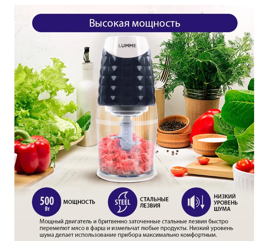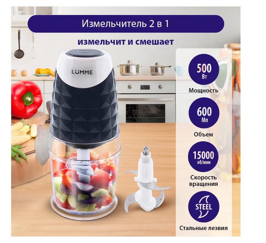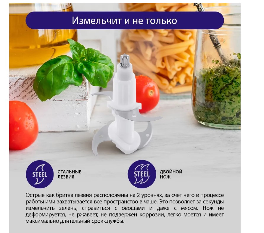 Мощный измельчитель с чашей объемом 0.6 литра. подходит для измельчения, взбивания, смешивания. 2 съёмных ножа из нержавеющей стали не деформируются, не ржавеют, не подвержены коррозии, легко моются и имеют максимально длительный срок службы. Удобен и прост в использовании, занимает при хранении немного места. Мощность 500 Вт обеспечивает широкие возможности применения. Емкость чаши 600 мл позволяет готовить на всю семью.