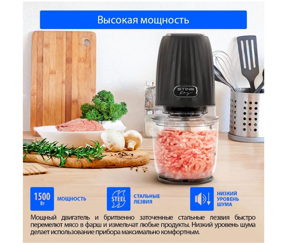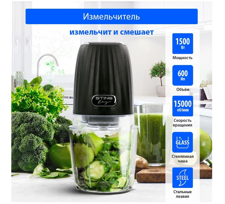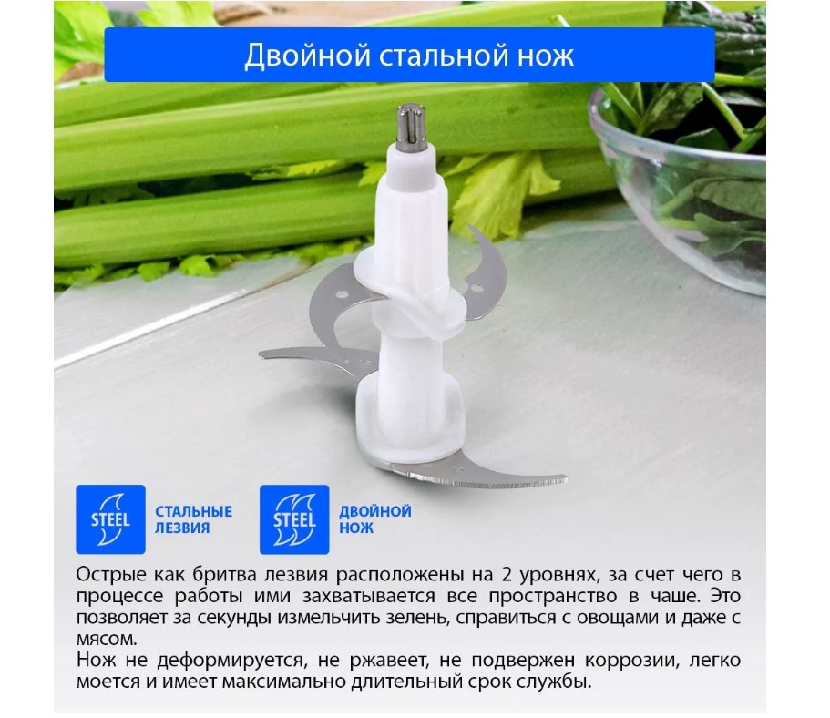 Мощный измельчитель со стеклянной чашей объемом 600 мл и одним скоростным режимом. Подходит для измельчения, взбивания, смешивания. 2 съёмных ножа из нержавеющей стали не деформируются, не ржавеют, не подвержены коррозии, легко моются и имеют максимально длительный срок службы. Прибор имеет кнопку управления, удобен и прост в использовании, занимает при хранении немного места.