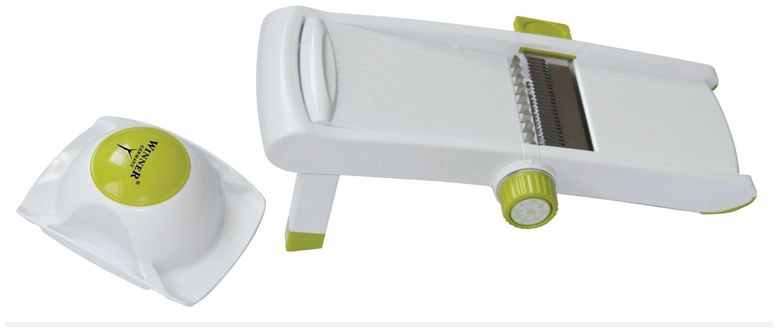 В наборе: держатель для ножей, нож с двойным лезвием для нарезки плоскими ровными или рифлеными ломтиками, нож для шинкования с переключателем ножей и регулятором толщины нарезки, держатель для продуктов. Состав: пластик пищевой, лезвия из нержав. ст