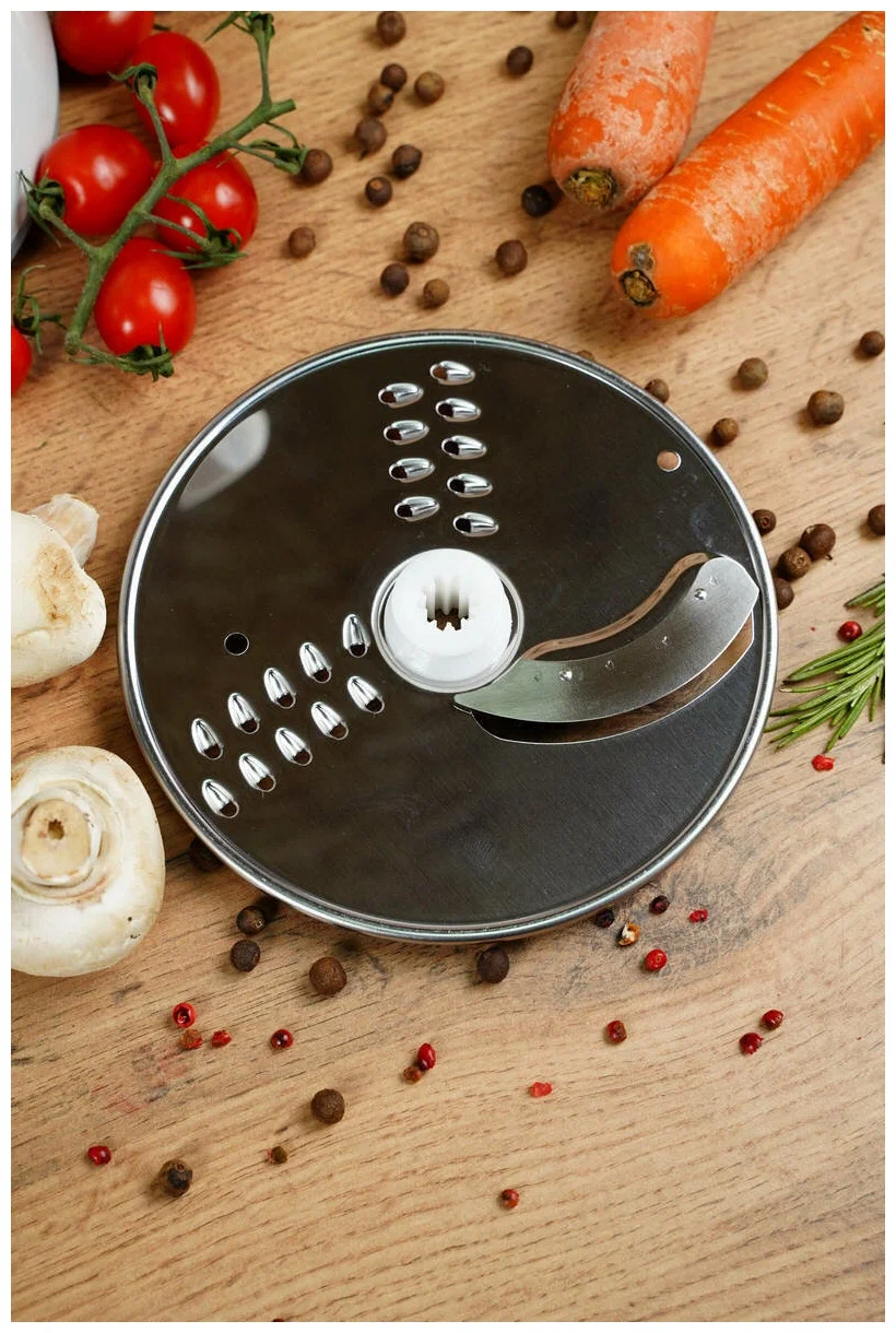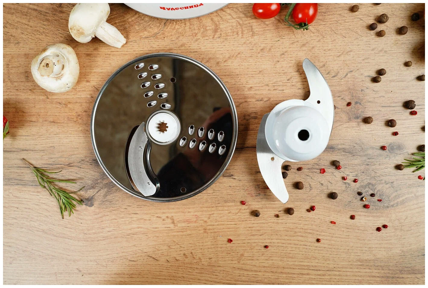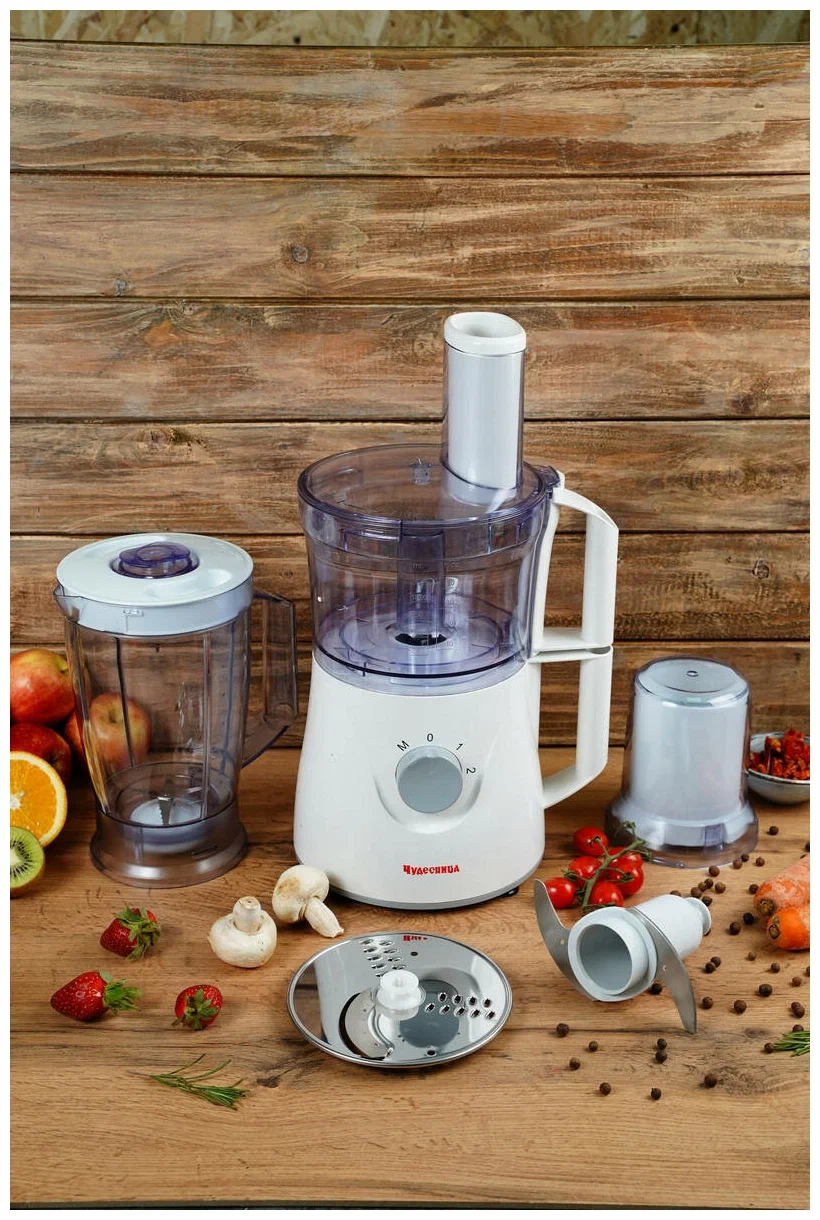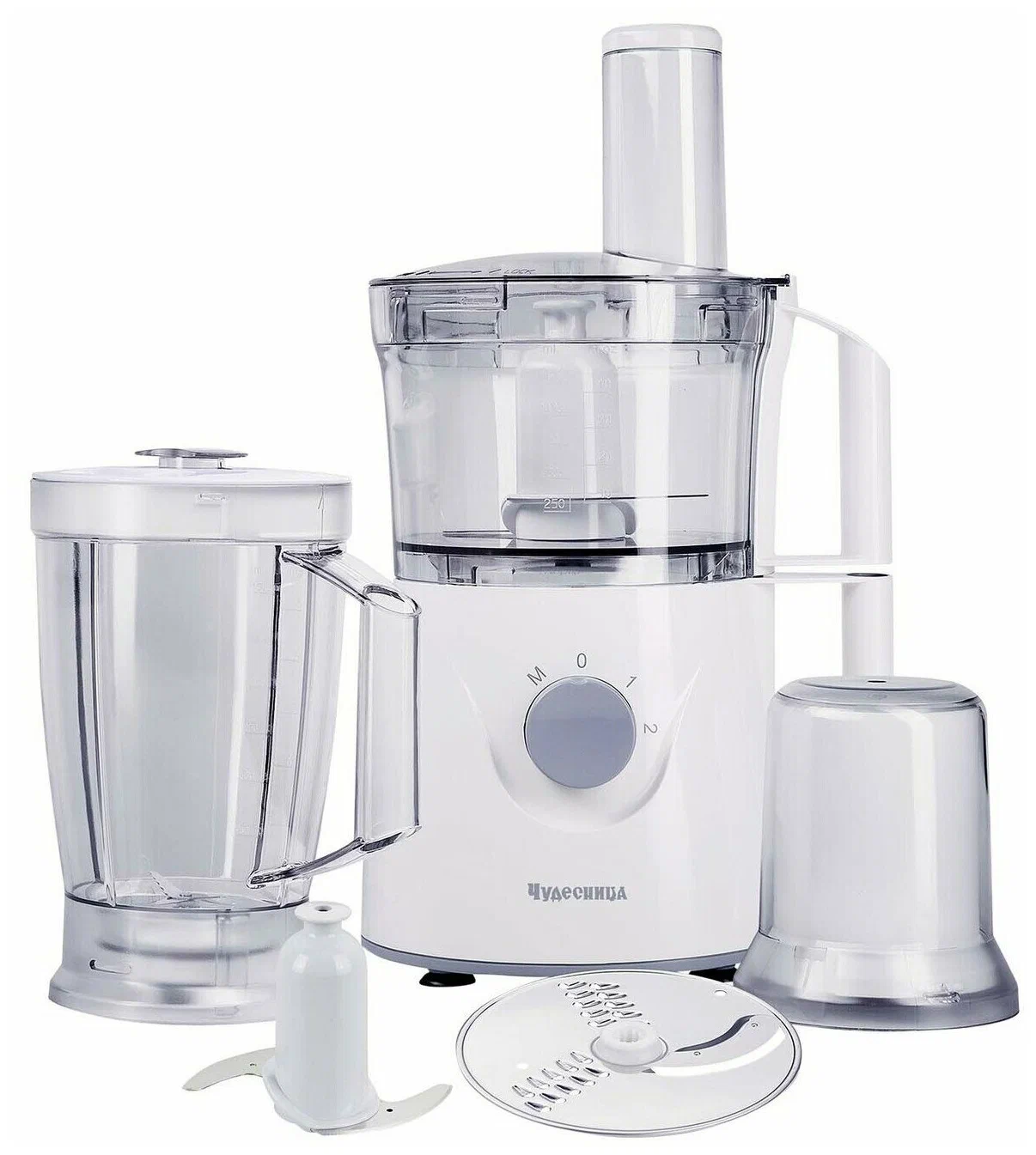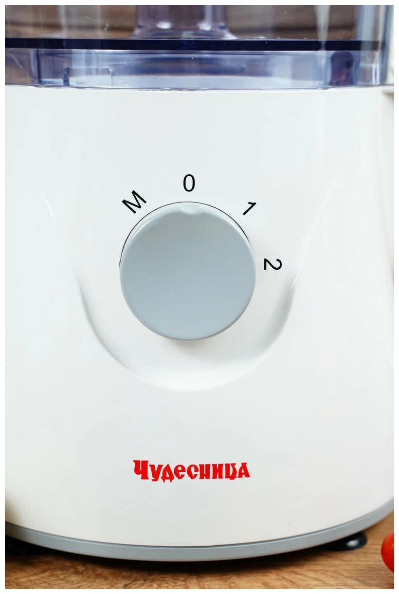 Кухонный процессор Чудесница КП-309Б. Максимальная мощность 800 Вт. Электропитание 220-240 В 50 Гц. 2 скорости + режим "Pulse". Регулировка скорости. Измельчитель 1.2 л, блендер 1.5 л, овощерезка. Диск для шинковки. Диск для картофеля фри. Насадка для замешивания теста. Универсальный нож. Эмульсионный диск для соусов и майонеза. Материал ножей нержавеющая сталь. Защитный замок.