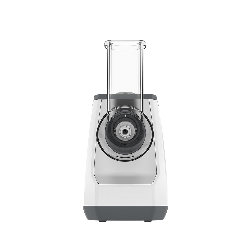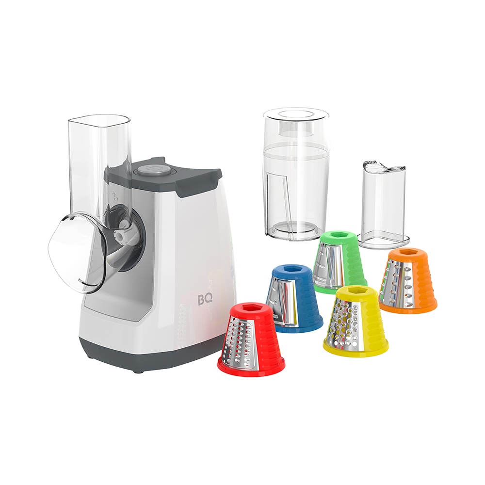 Моторный блок, блок овощерезки, мелкая терка, крупная терка, терка-измельчитель, шинковка для тонких ломтиков, шинковка для крупных ломтиков, органайзер для хранения сменных насадок, толкатель, руководство по эксплуатации