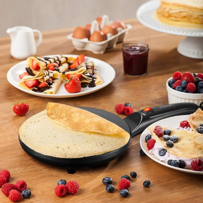 Благодаря антипригарному покрытию готовить можно с минимальным количеством масла: масло добавляется в тесто, поэтому при выпечке оно не разбрызгивается в разные стороны. Блинница оснащена термостатом для поддержания постоянной температуры.