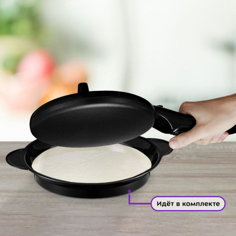 В комплекте идёт блюдце для блинного теста. Разогретая в течение 5-7 мин поверхность блинницы погружается в тесто на 5-8 секунд, а затем ставится на стол для дальнейшей жарки. Через 60-90 сек блин переворачивается, и ещё после 60-90 сек блин готов!