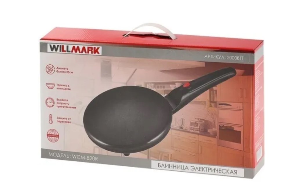 Погружная блинница WILLMARK WCM-820R - является хорошим помощником на кухне, имеет элегантный внешний вид и проста в использовании. Корпус модели выполнен из высокопрочного пластика, снабжен тремя ножками. Есть антипригарное покрытие. Рабочая площадь диаметром 20 сантиметров. Мощность прибора 1000 Ватт, что позволяет быстро прогревать рабочую поверхность до нужной температуры. Имеется функция защиты от перегрева. На ручке расположен переключатель включения/выключения устройства. Вес блинницы всего 0,8 килограмм. Так же в комплект входит тарелка под тесто. Для получения идеально ровного и тонкого блина, необходимо погрузить разогретую поверхность блинницы в тесто на несколько секунд, подождать пока оно схватится и перевернуть устройство. Затем, довести блин до готовности и можно заворачивать любую начинку. Благодаря антипригарному покрытию можно уменьшить количество масла или вовсе его не добавлять.