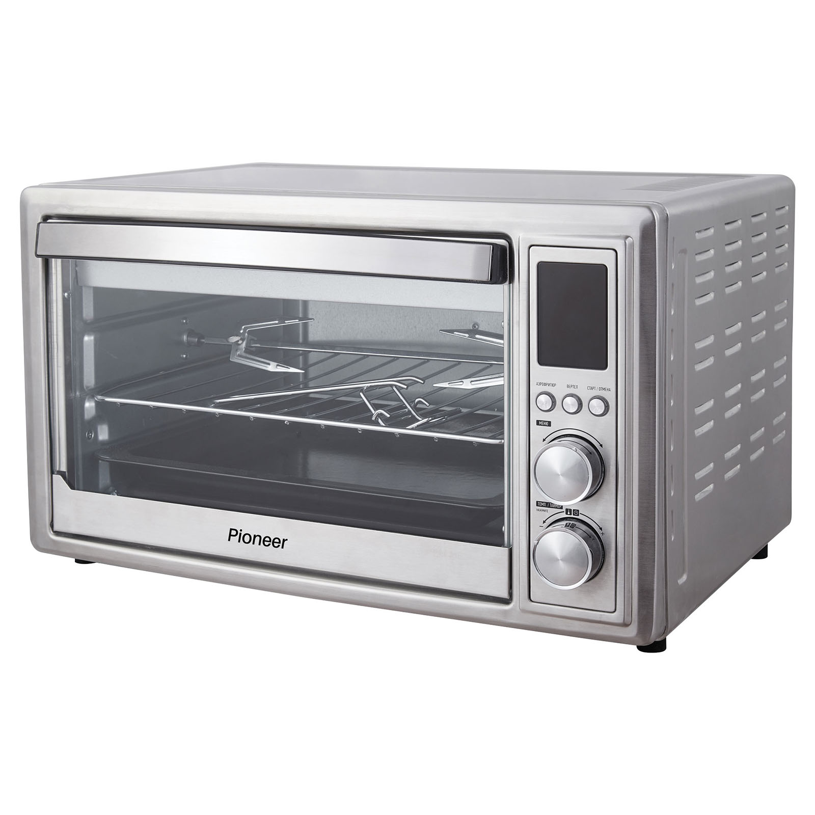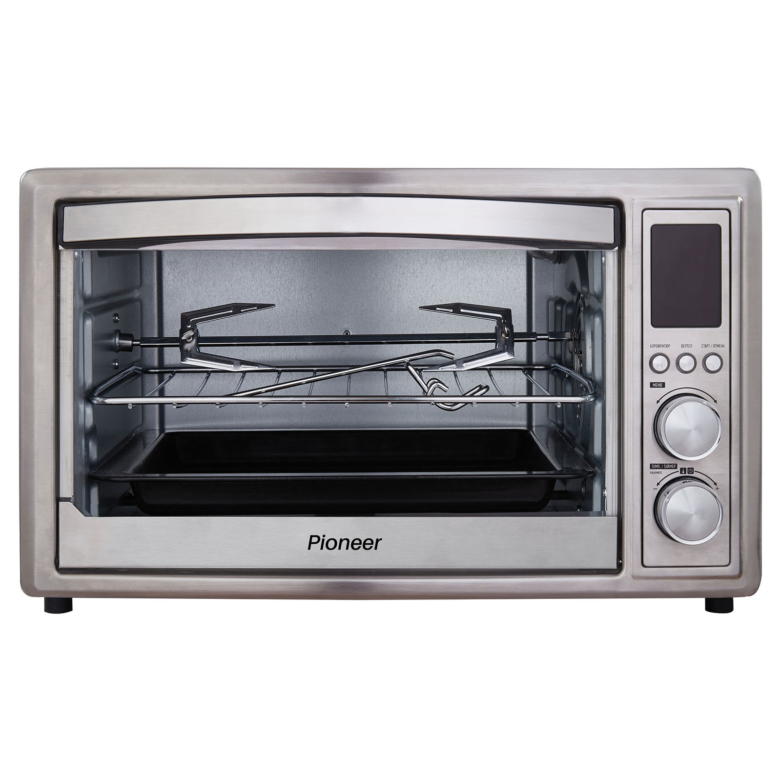 Комплектация: электропечь, металлическая решетка, плоский противень, ухват для противня, вертел, держатель для вертела, лоток для крошек, корзина для аэрофритюра, гарантийный талон, инструкция на русском языке