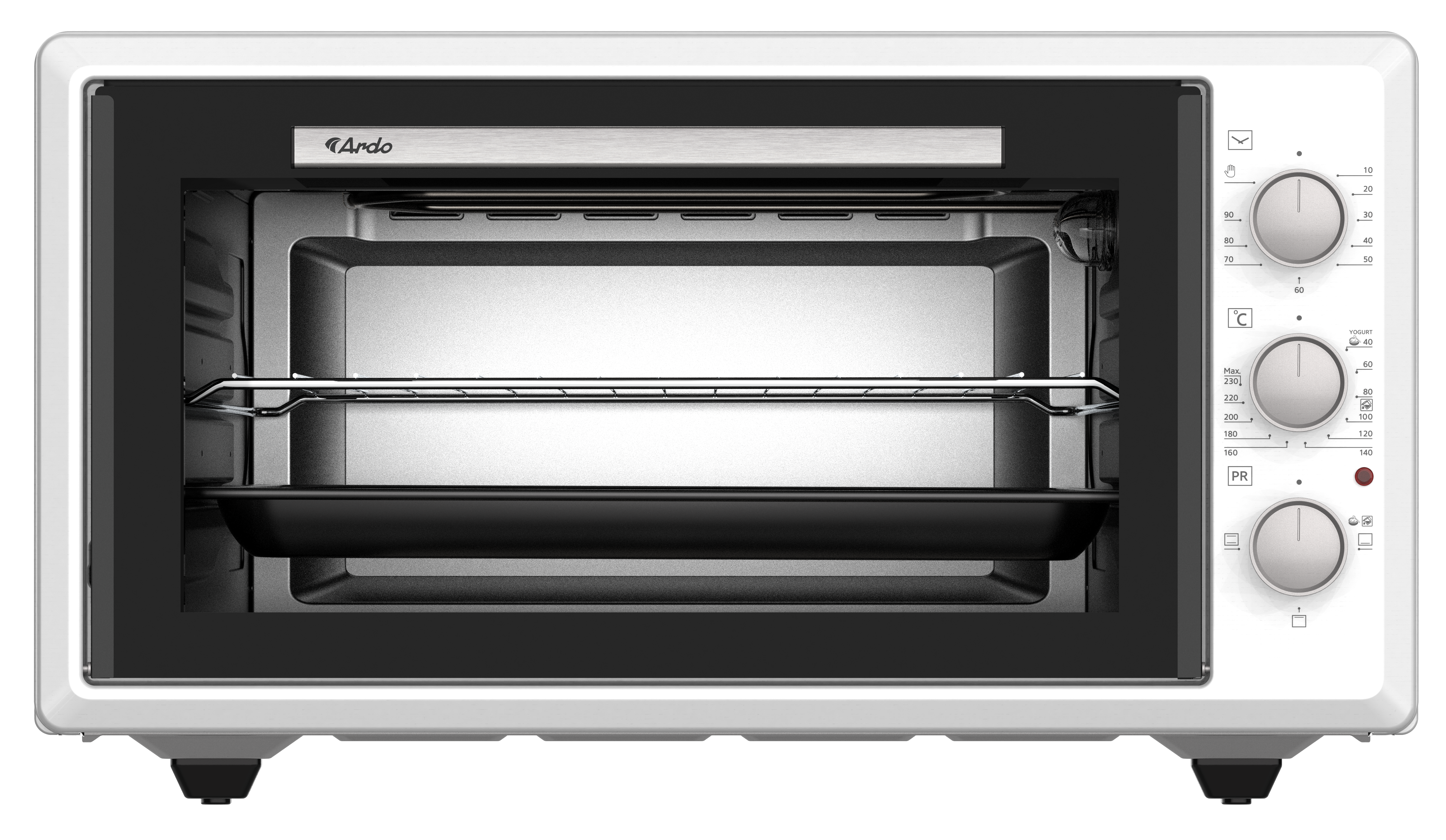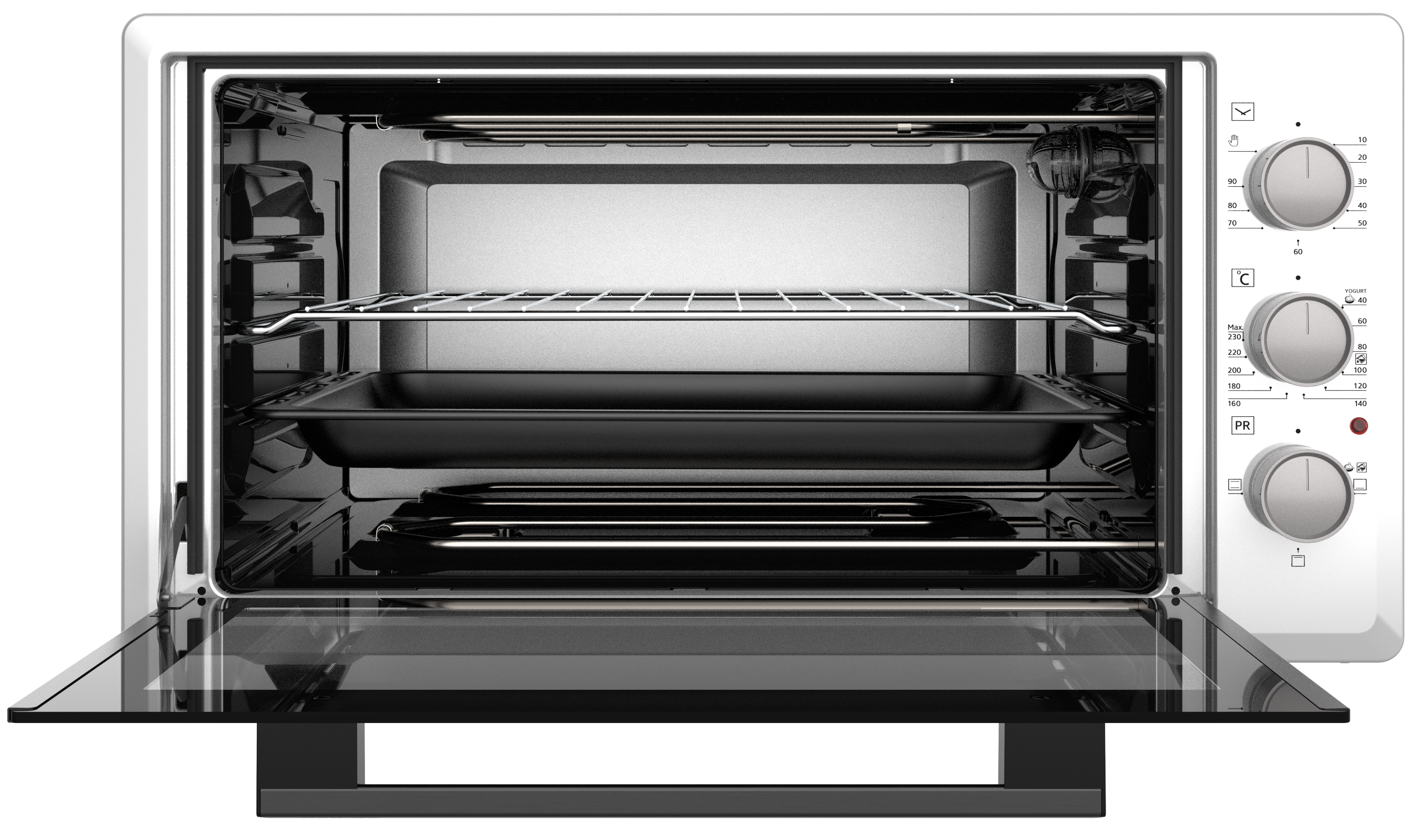 Комплектация мини печь; 1 стандартный эмалированный квадратный противень; 1 решетка; 1 эмалированный круглый противень