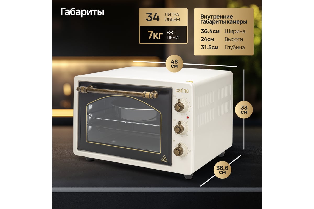 Мини-печь M3417 от бренда CARINO – идеальное решение для тех, кто ценит эффективность и компактность в кухне. С объемом 34 литра и мощностью 1300 Вт, эта печь обеспечивает быстрое и равномерное распределение тепла благодаря возможности выбора режима работы: верхний нагрев, нижний нагрев или их комбинация. Внутреннее покрытие камеры из нержавеющей стали гарантирует долговечность и легкость ухода. Управление механическим способом делает использование печи удобным и интуитивно понятным. Откидная дверца обеспечивает легкий доступ к пище, а максимальная температура до 230 °C позволяет готовить разнообразные блюда. Мини-печь M3417 от CARINO – ваш надежный помощник в кухне, который сочетает в себе качество и практичность.