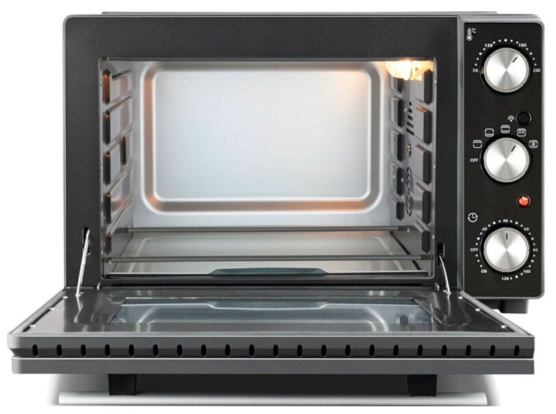 9 программ, передняя панель зеркальная, 4 уровня полок, камень для пиццы 30 см, двойное стекло двери, защита от перегрева