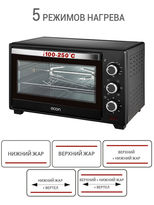 - верхний гриль, верхний нагрев, нижний нагрев, верхний+нижний нагрев