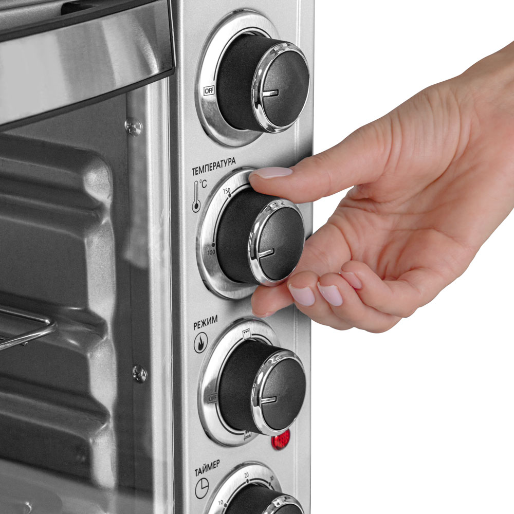 Особенности и дополнительные функции 4 нагревательных элемента из нержавеющей стали, Внутренняя подсветка, Конвекция, Таймер 60 минут с функцией автоотключения и звуковым сигналом, Режимы нагрева: верхний, нижний, двухсторонний, Регулировка температуры в диапазоне от 100° до 250°С градусов, Индикатор работы печи, Большая дверца и удобная ручка с декоративной стальной вставкой