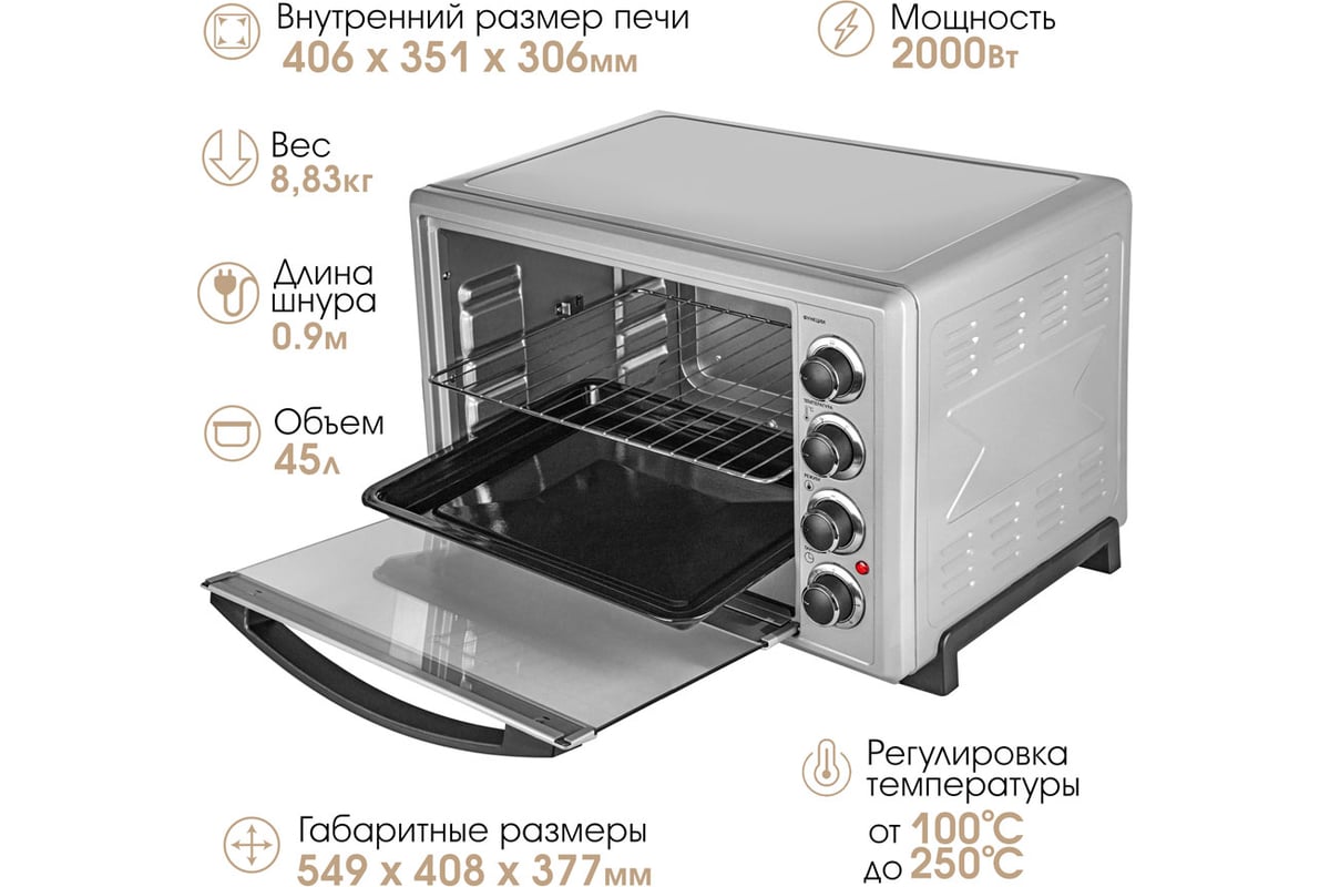 Мини-печь Endever Danko 4047, серебристый цвет, мощность 2000 Вт, объем 45 л, 1 шт в упаковке 90404 предназначена для приготовления еды.
