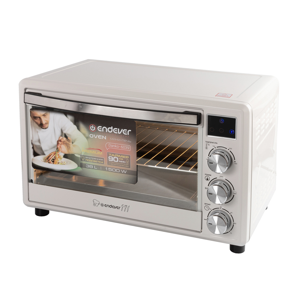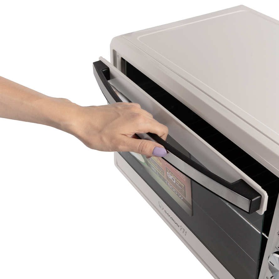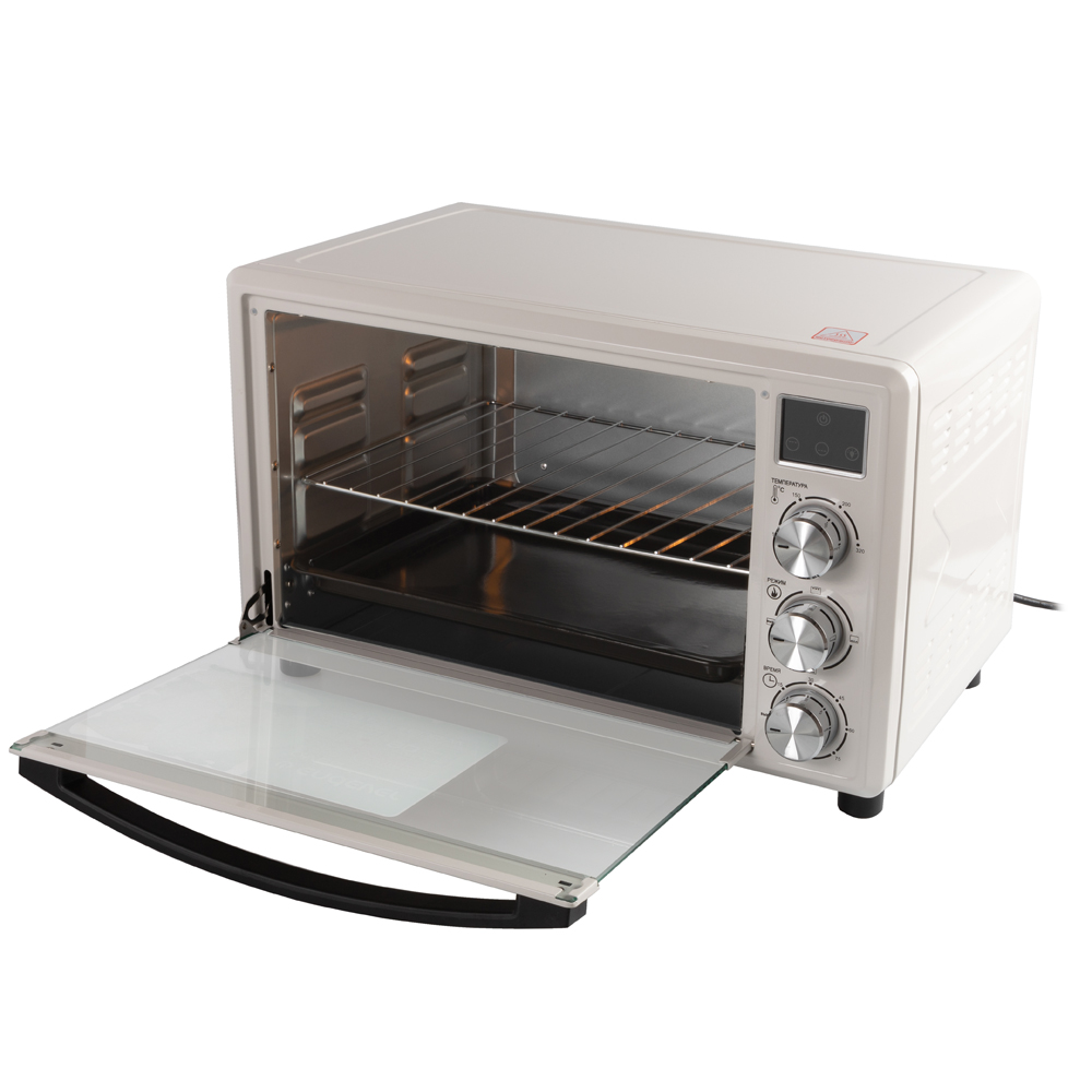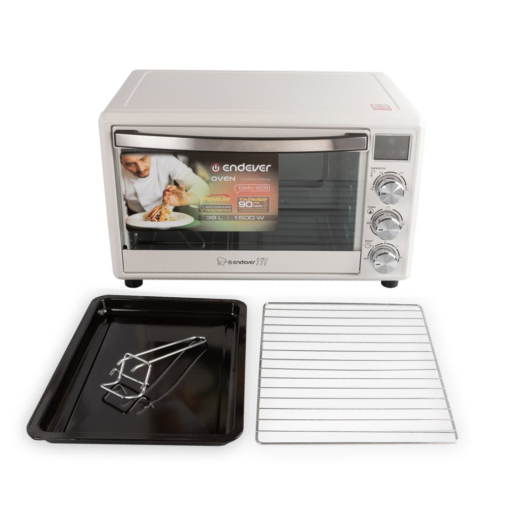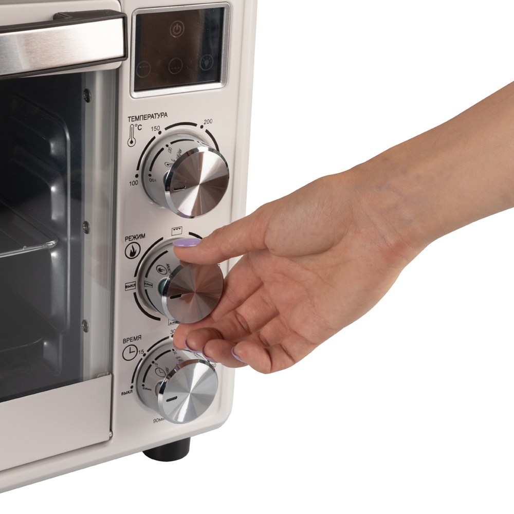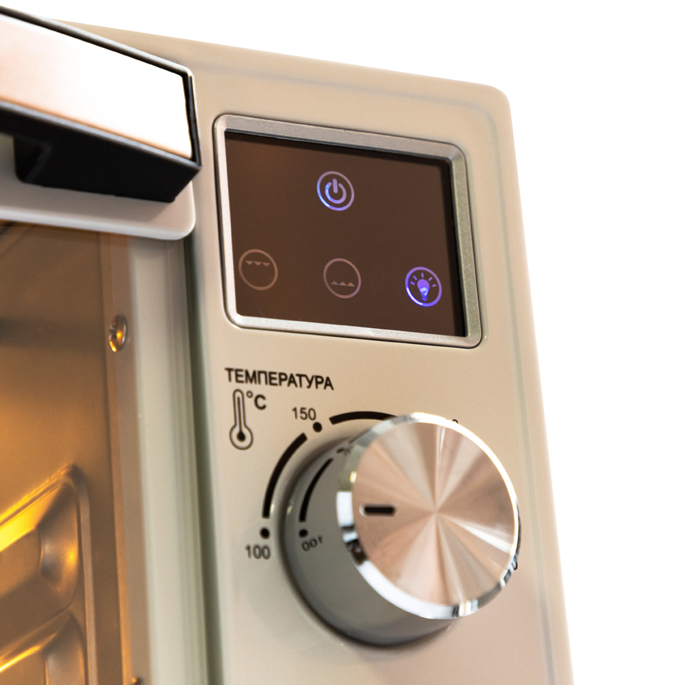 Размер противня 37.5*27.3*2.6 см, Размер решетки 37.5*27*0.5 см, Нагревательные элементы из нержавеющей стали, Информативный дисплей с индикаторами режимов работы, Внутренняя подсветка , Большая дверца и удобная ненагревающаяся ручка, Регулировка температуры в диапазоне от 100°С до 320°С, Таймер на 90 мин с функцией автоотключения и звуковым сигналом, Три режима нагрева: верхний, нижний, двухсторонний