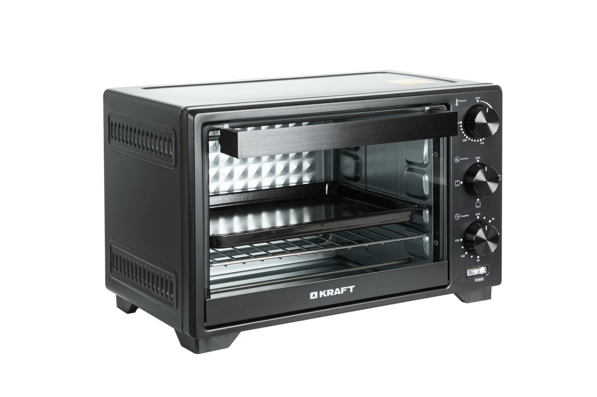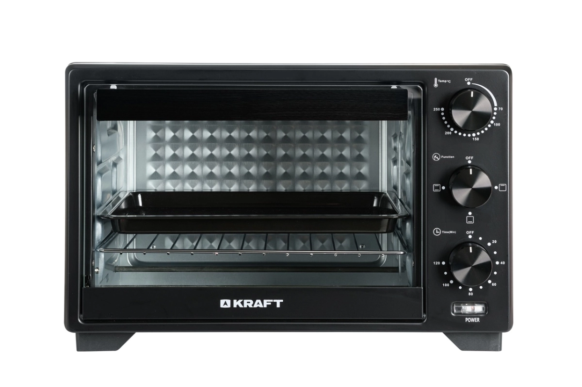 Комплектация: мини-печь, глубокий прямоугольный противень, перчатки и решетка, документация