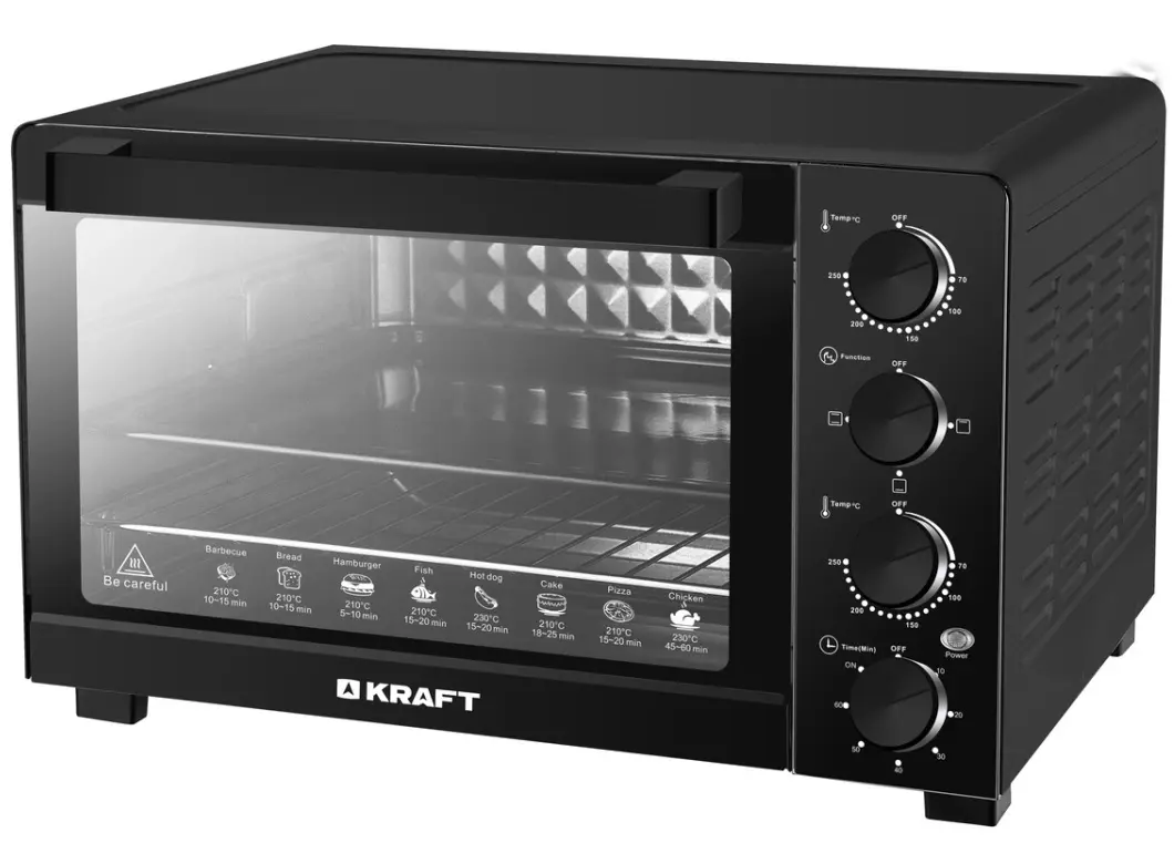 Комплектация: мини-печь, глубокий прямоугольный противень, перчатки и решетка, документация