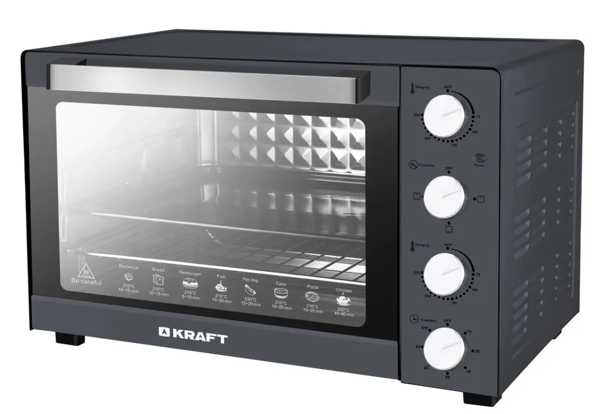 Комплектация: мини-печь, прямоугольный противень для выпечки, круглый противень, перчатки, решетка, документация