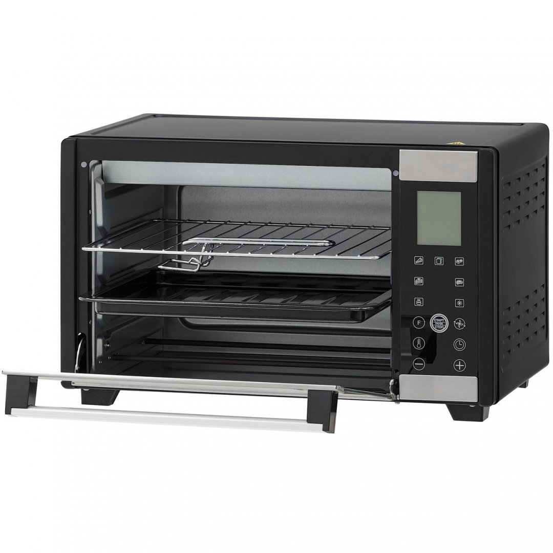 Цифровое сенсорное управление. Увеличенный объем. Противень с ручкой в комплекте. 7 автоматических программ. 6 режимов работы с конвекцией. Электронный программатор. Плавная регулировка температуры.