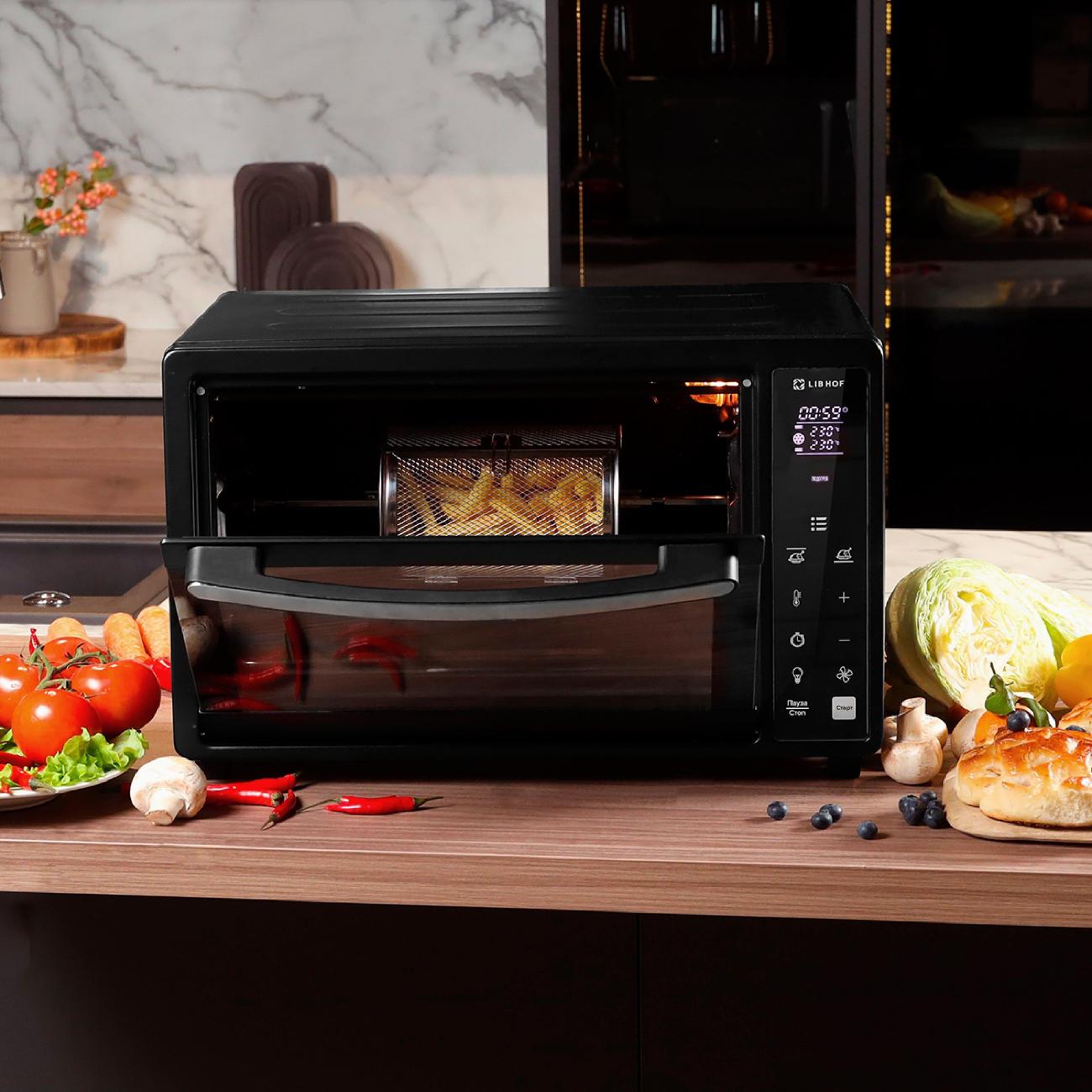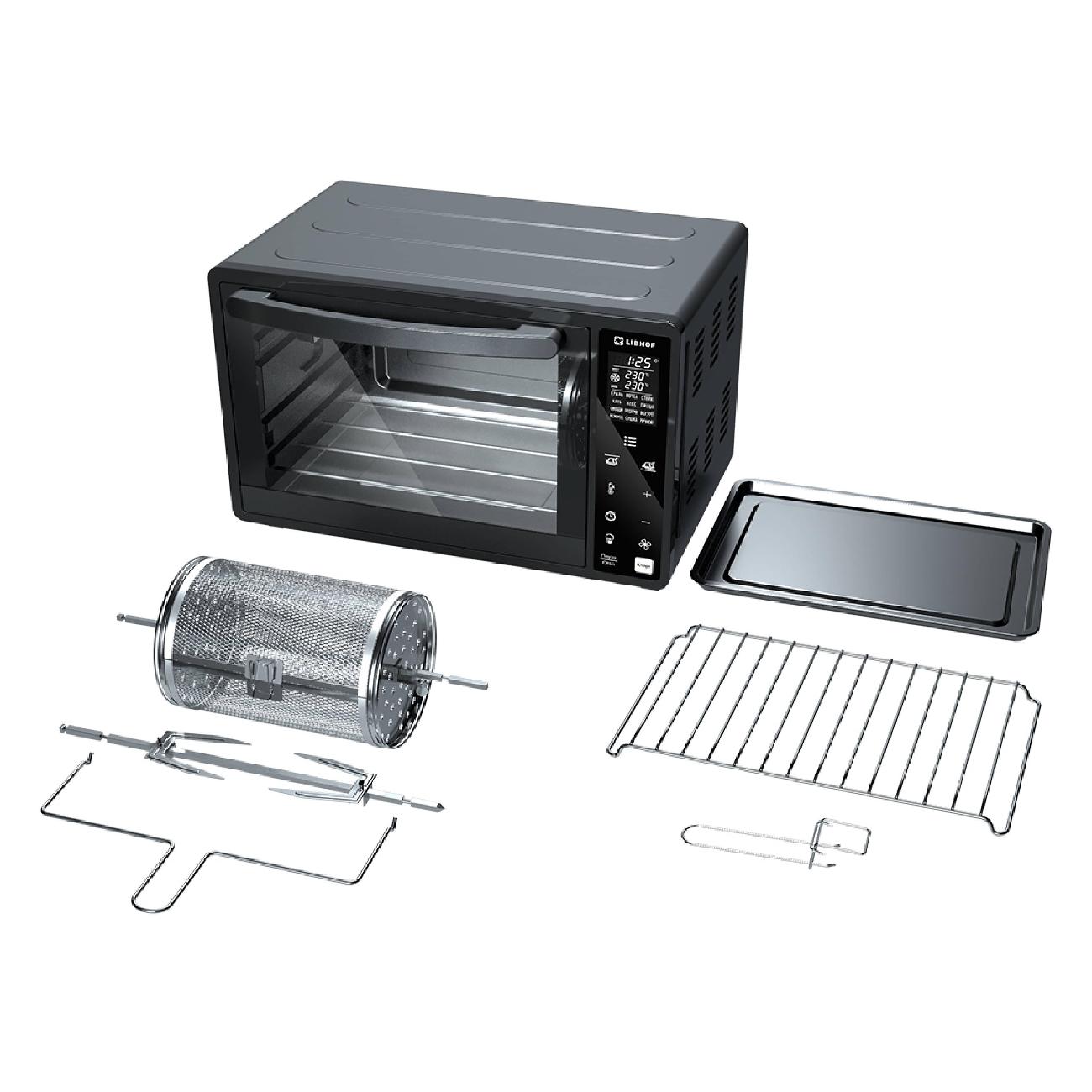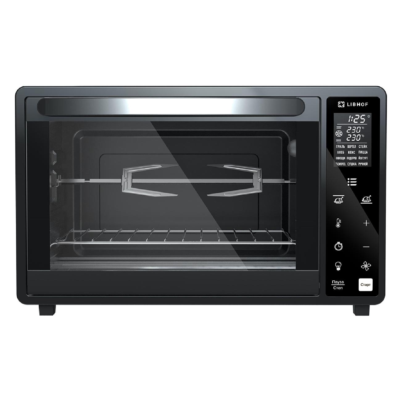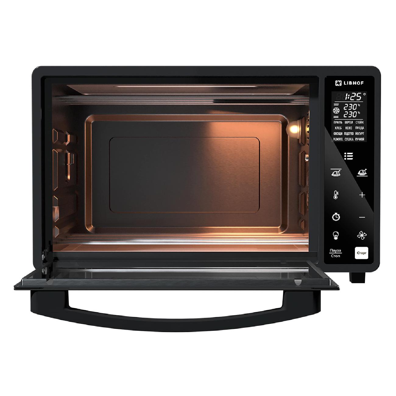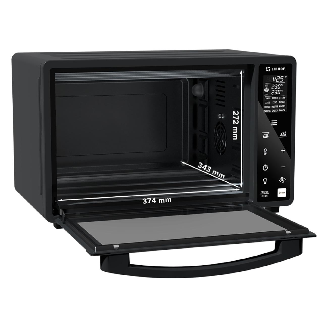 Черная мини-печь Libhof OVX-36 при габаритах 32,5х51,3х40,3 см и весе 8 кг вмещает 36 л. Модель управляется при помощи сенсорной панели с поддержкой 12 автоматических программ, звуковым сигналом, таймером и индикацией, оповещающей о включении и выбранной температуре. Устройство питается от сети посредством 0,8 м кабеля и потребляет 1500 Вт. Предусмотрен гриль, конвекция, функция предварительной разморозки и нагрев до максимальных 230°С.