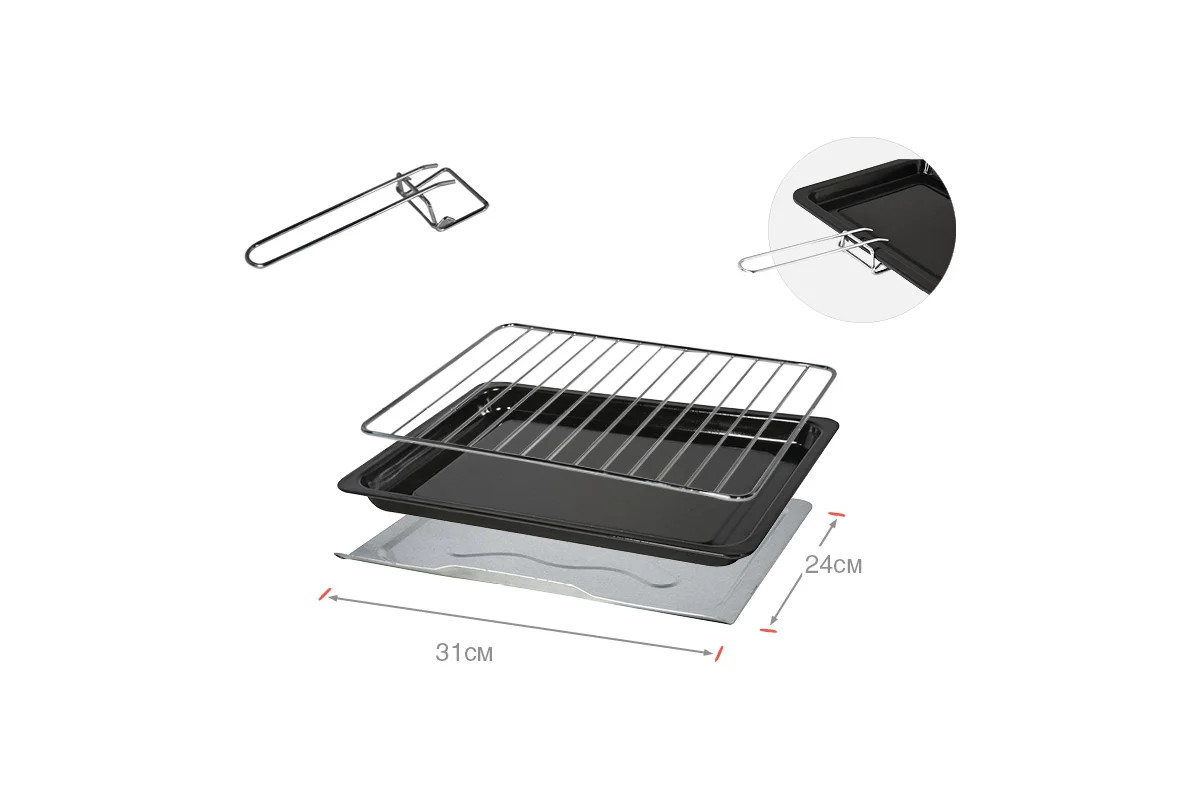 В комплекте есть эмалированный противень, решетка, поддон для крошек и ручка для решетки.