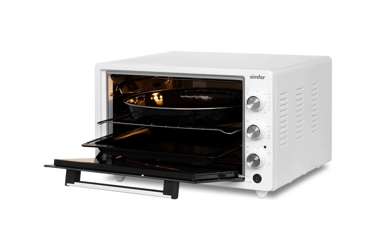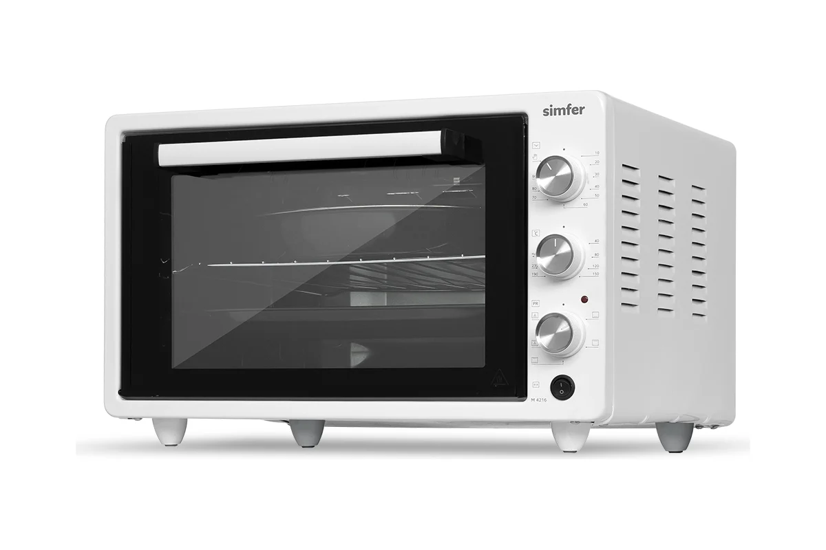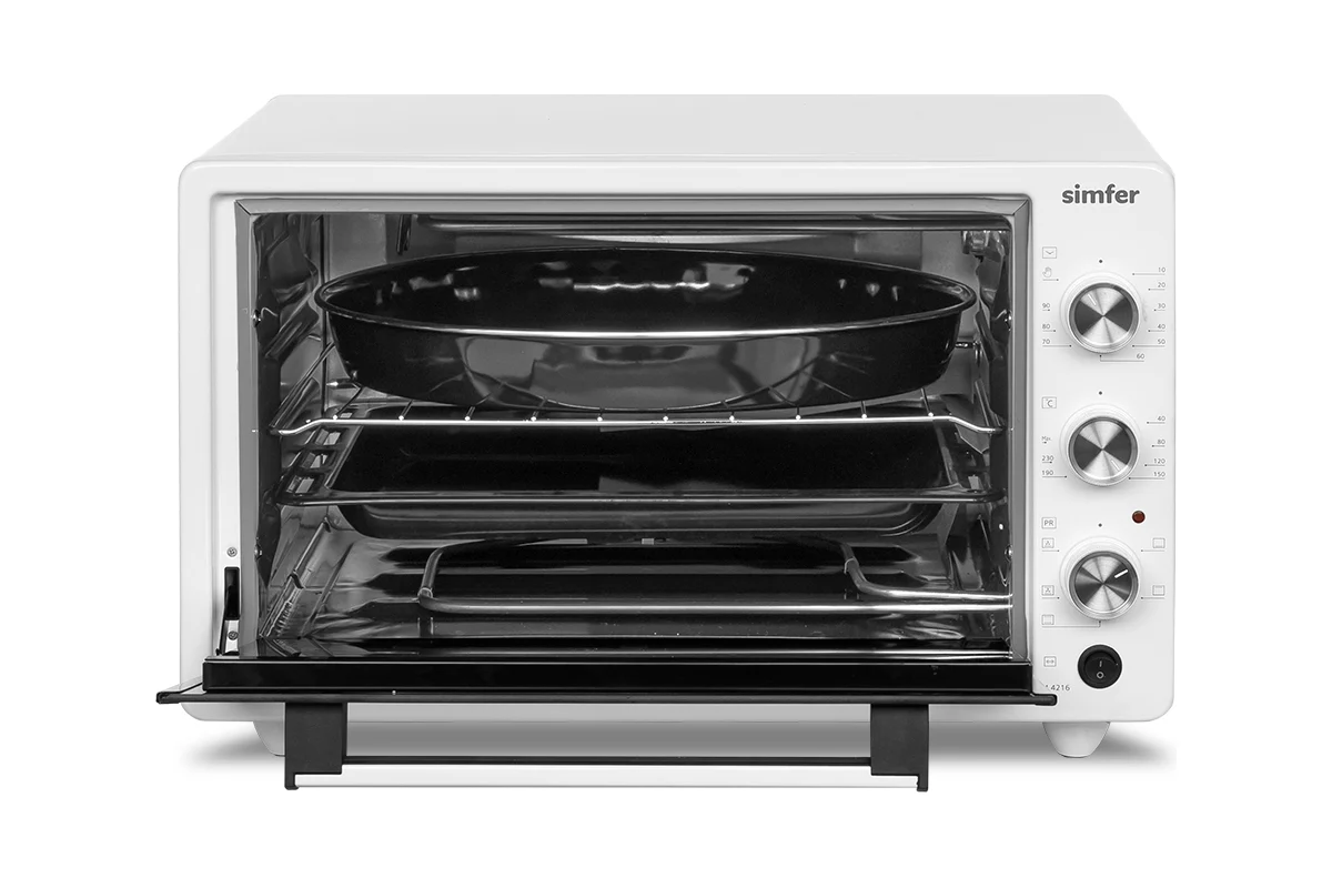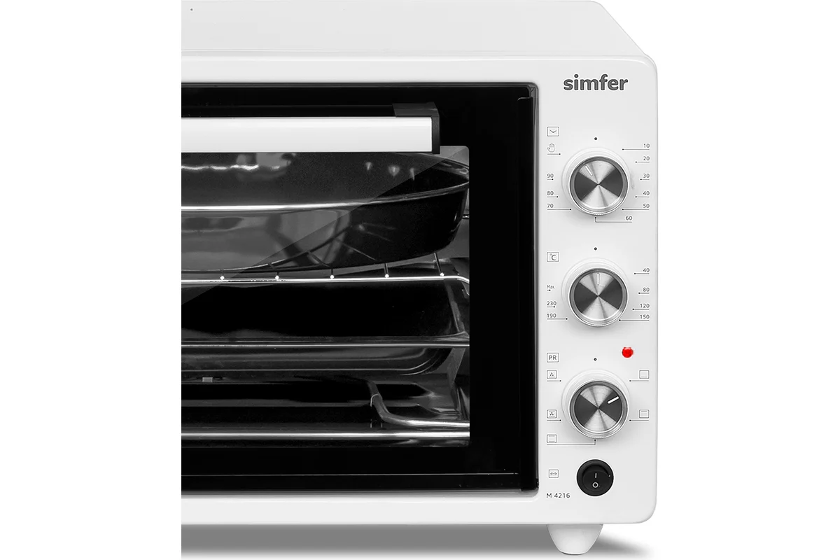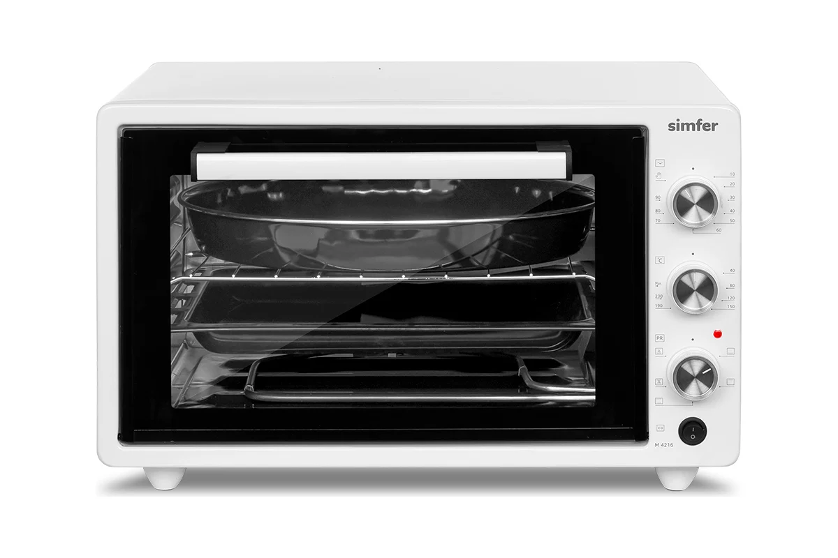 Мини-печь SImfer Albeni Plus, 6 режимов, конвекция M4216 имеет шесть рабочих режимов, в число которых входят: верхний нагрев; нижний нагрев; комбинированный нагрев (верхний и нижний); вертел; нижний нагрев с конвекцией; комбинированный нагрев с конвекцией. Первые два лучше подходят для подогрева пищи. Третий позволяет приготовить практически любое блюдо. Вертел становится отличным дополнением к трем предыдущим, особенно – комбинированному нагреву, так как позволяет приготовить, например, курицу гриль с ароматной и очень вкусной хрустящей корочкой.