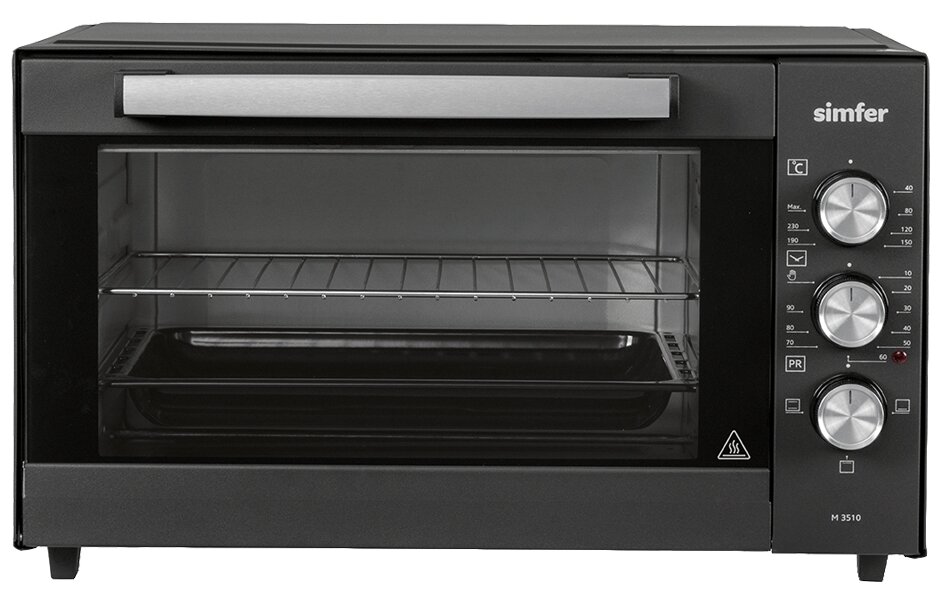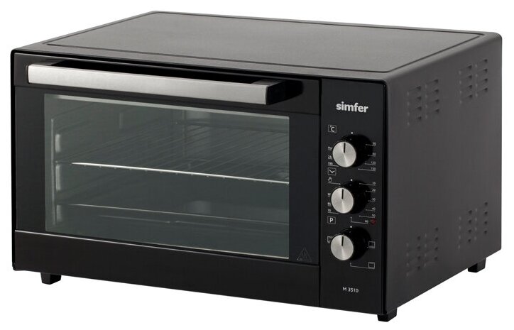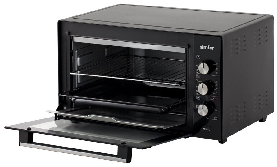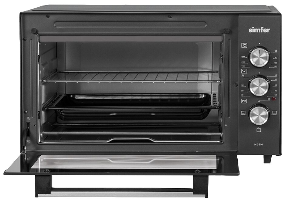 3 режима работы; ручка с защитой от нагревания; поворотные переключатели; автоотключение; электрический термостат; 1 стекло дверцы; рельефные направляющие; противень с антипригарным покрытием; поддон для крошек; решетка из хромированной стали; звуковой сигнал отключения; очистка духовки паром; при первом запуске рекомендуется протопить печь 45 минут при температуре 200 °C для прогорания заводской смазки; количество противней в комплекте: 1
